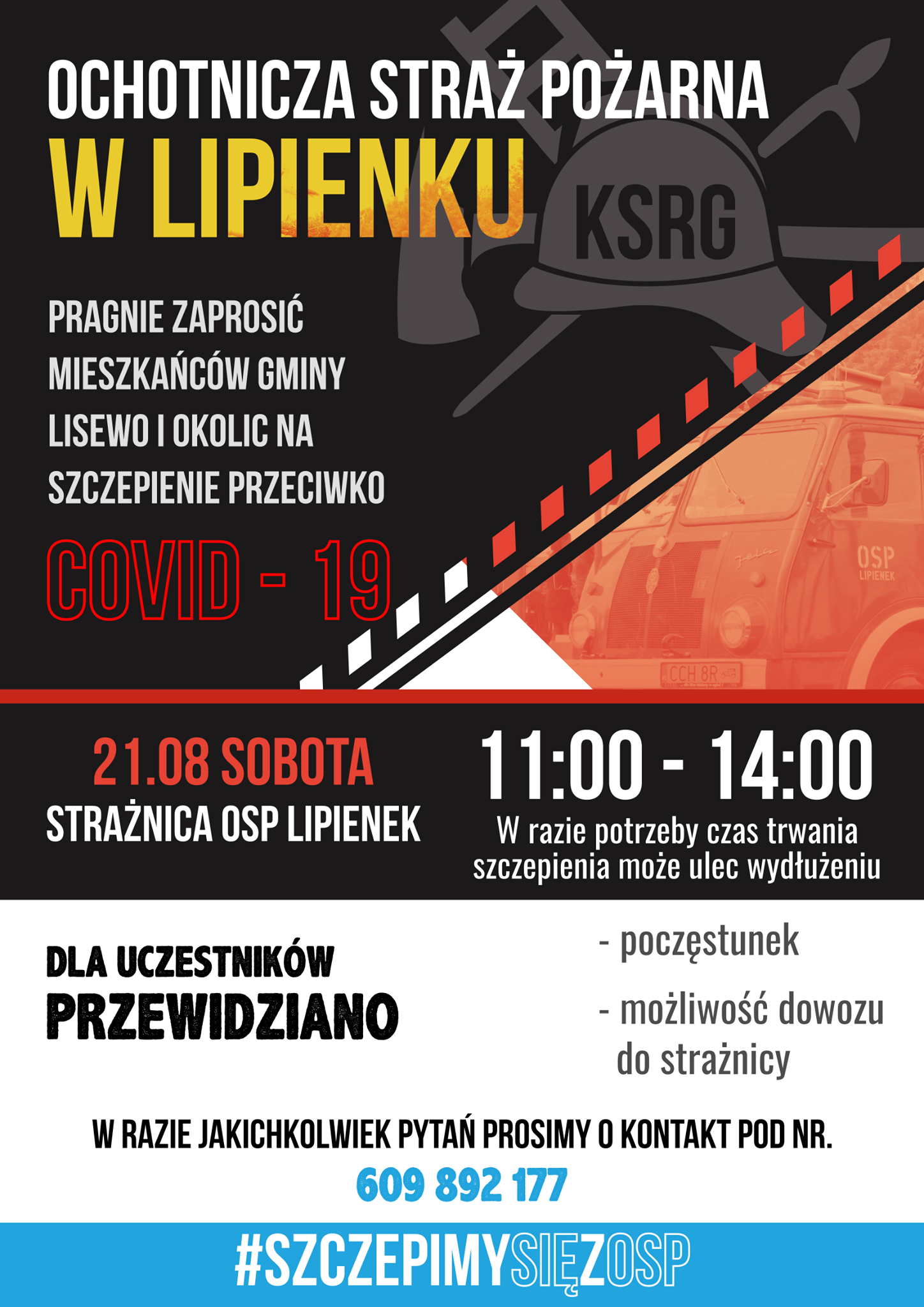 Na szczepienie zapraszają również druhowie z OSP Lipienek, którzy w dniu 21 sierpnia 2021 r. organizują podobną akcję, zapewniając możliwość dowozu i poczęstunek.
