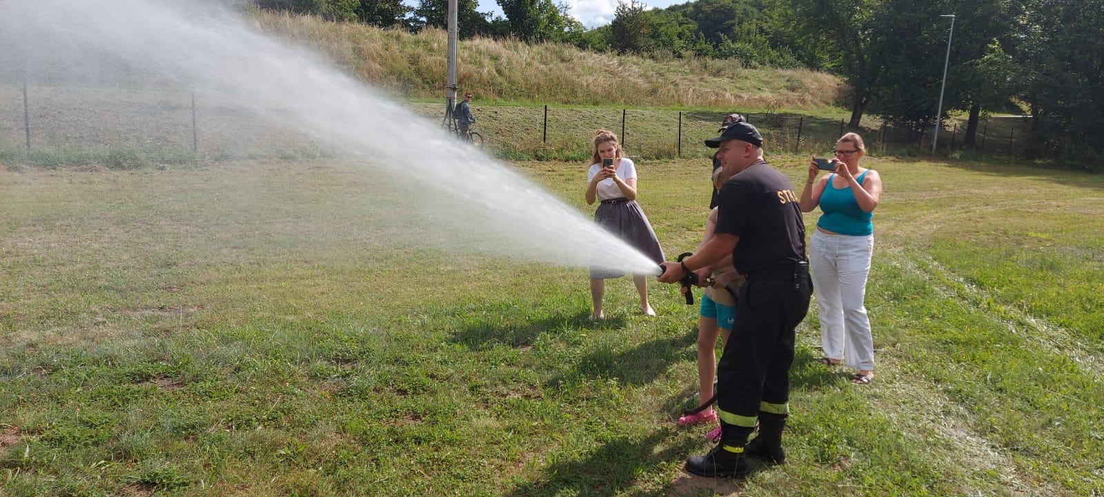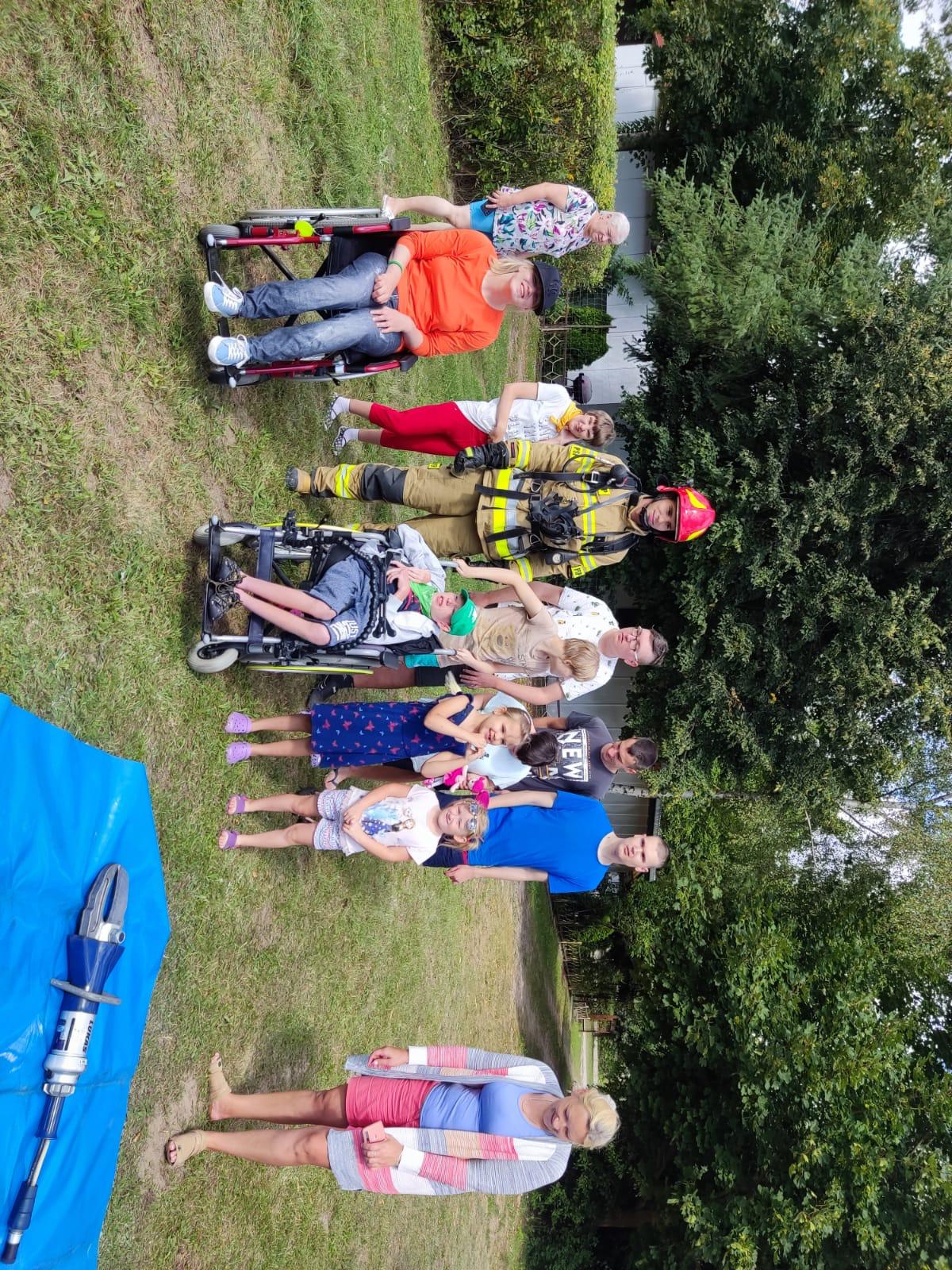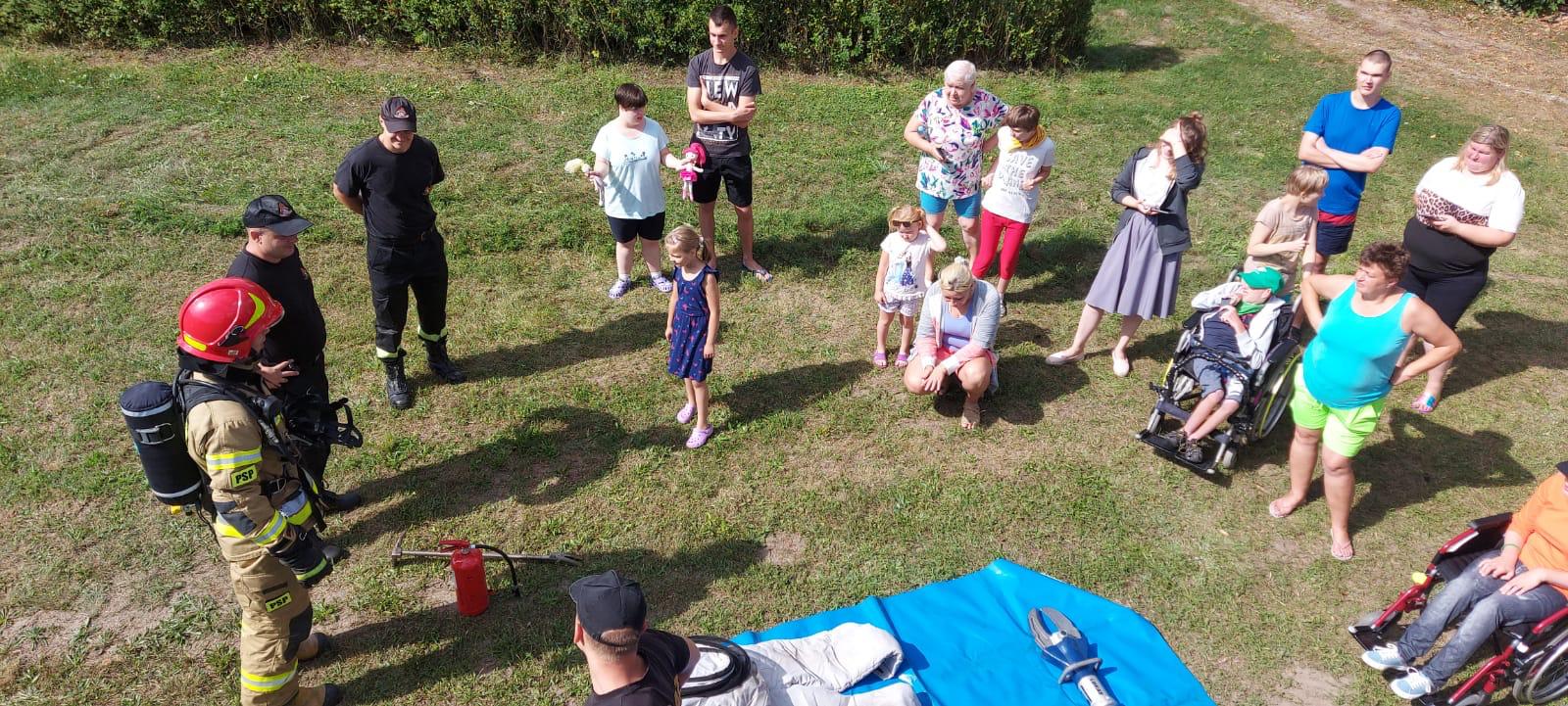 Strażacy z KP PSP w Chełmnie odwiedzili grupę dzieci i młodzieży z Torunia, podczas ich kolonii nad Jeziorem Starogrodzkim