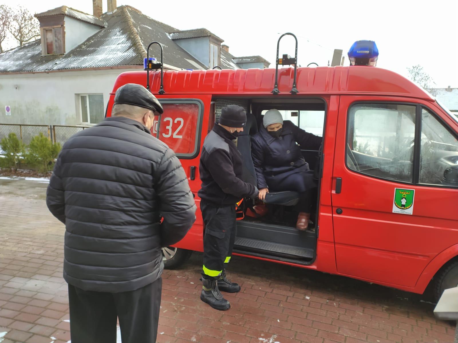 Jednostka OSP Trzebcz Szlachecki udzielała pomocy dwóm osobom starszym, mających problemy z poruszaniem się w dowozie z miejsca zamieszkania do punktu szczepień w miejscowości Kijewo Królewskie.