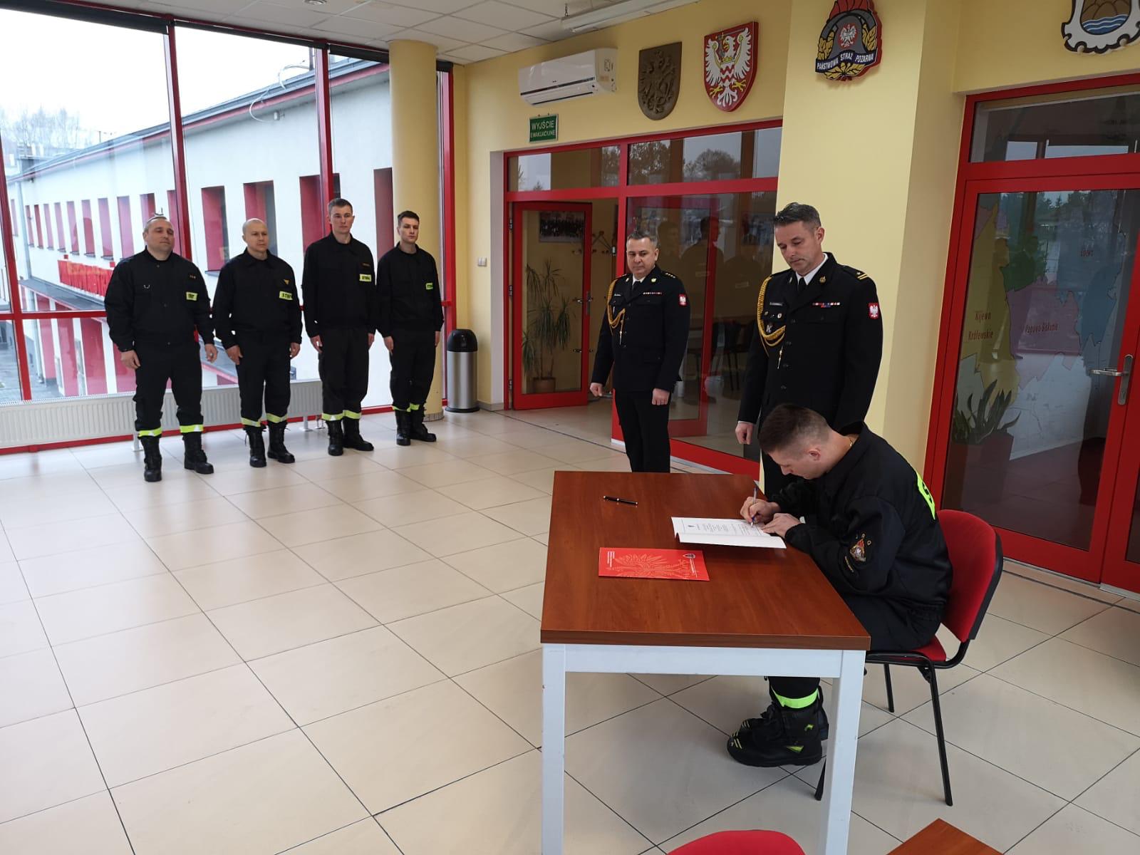 Po wypowiedzeniu roty ślubowania strażacy złożyli podpisy pod aktem ślubowania, pieczętując w ten sposób ważny moment w ich karierze zawodowej.