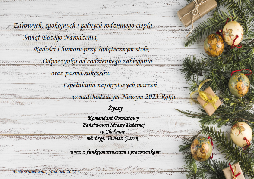 Życzenia Świąteczne Komendanta Powiatowego PSP w Chełmnie 23.12.2022 Zdjęcia (1) Pokaż zdjęcie 1 z galerii.