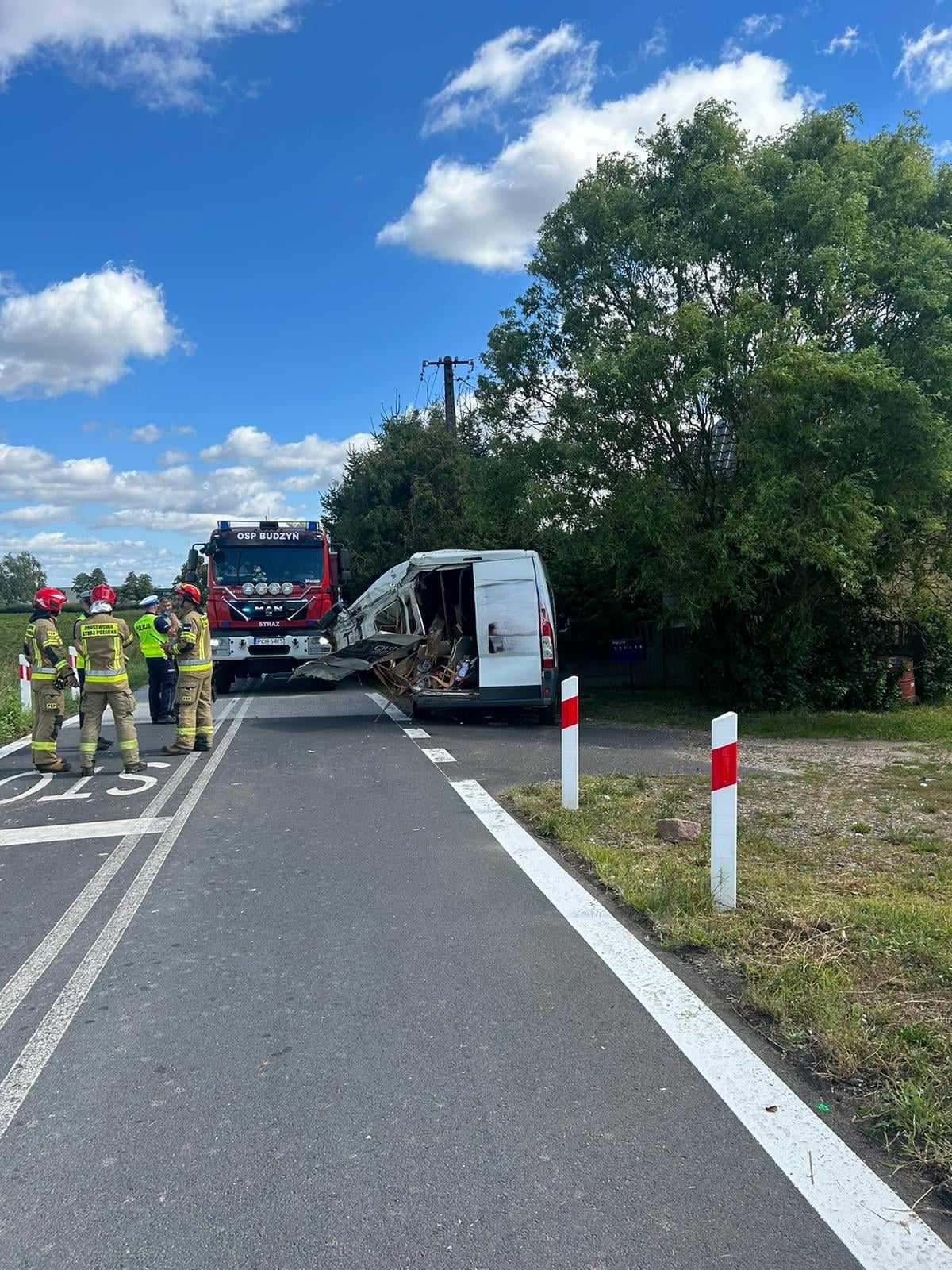 Po dojeździe na miejsce zdarzenia strażacy stwierdzili, że pociąg osobowy relacji Poznań - Kołobrzeg uderzył w lewy bok i tył samochodu typu bus na przejeździe kolejowym; brak jest osób poszkodowanych, kierowca samochodu podróżował sam. Rozbity samochód znajduje się na drodze gminnej. Pociąg znajduje się około 300 metrów od miejsca wypadku; pociągiem jechało 250 osób. Do zdarzenia doszło na niestrzeżonym przejeździe kolejowym w miejscowości Budzyń – przejazd Nowe Budy.