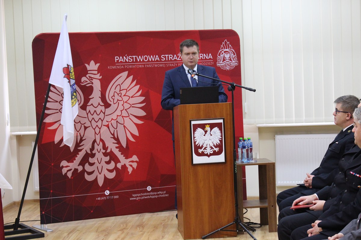 Gospodarz uroczystości Komendant Powiatowy PSP w Chodzieży mł. bryg. Adam Grunwald powitał gości w osobach: