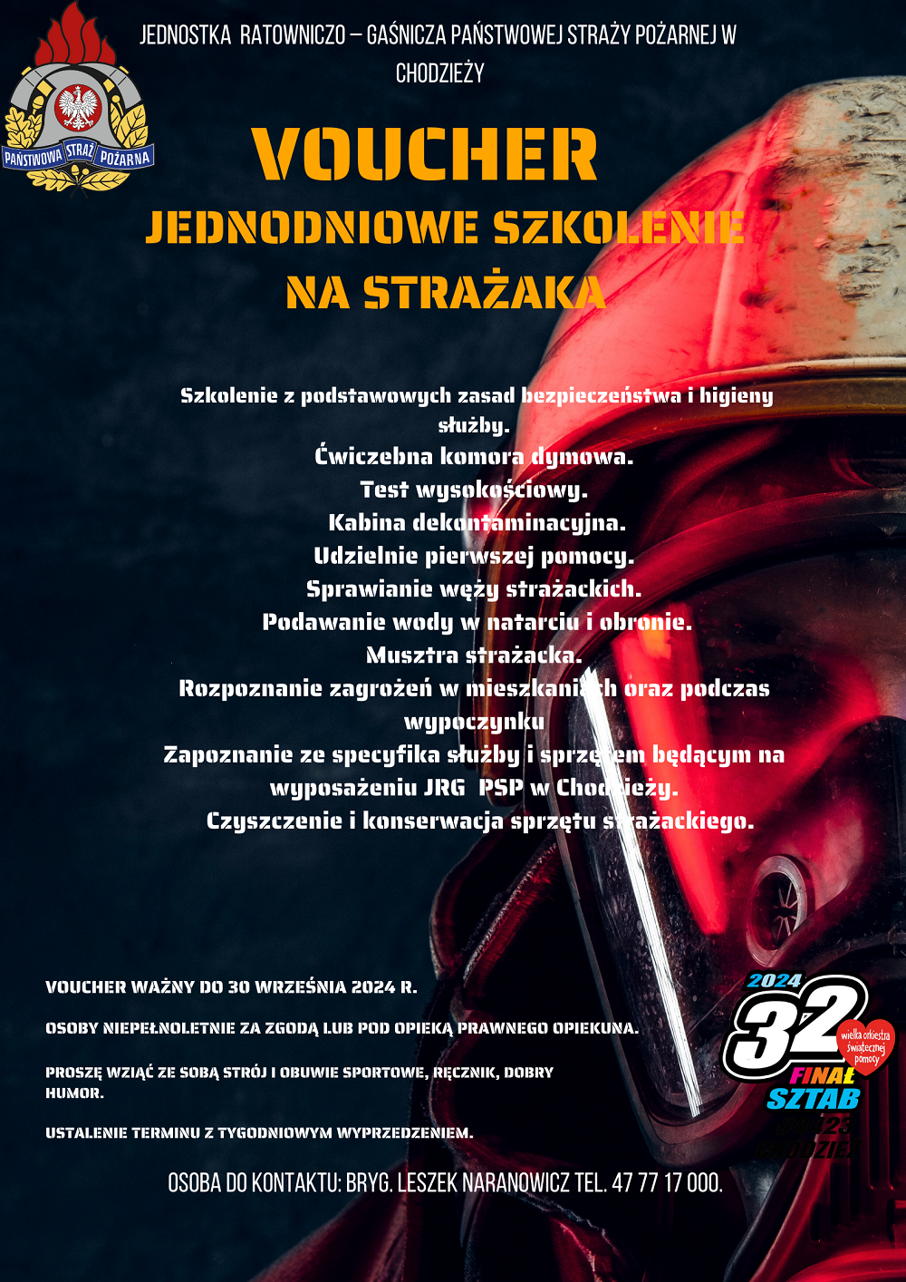 Funkcjonariusze Komendy Powiatowej Państwowej Straży Pożarnej w Chodzieży w myśl hasła „GASIMY OGIEŃ, ROZPALAMY SERCA!” przygotowali Vouchery na zwiedzanie Jednostki Ratowniczo – Gaśniczej PSP w Chodzieży oraz na jednodniowe szkolenie na strażaka. Ponadto licytowano również hełm strażacki.