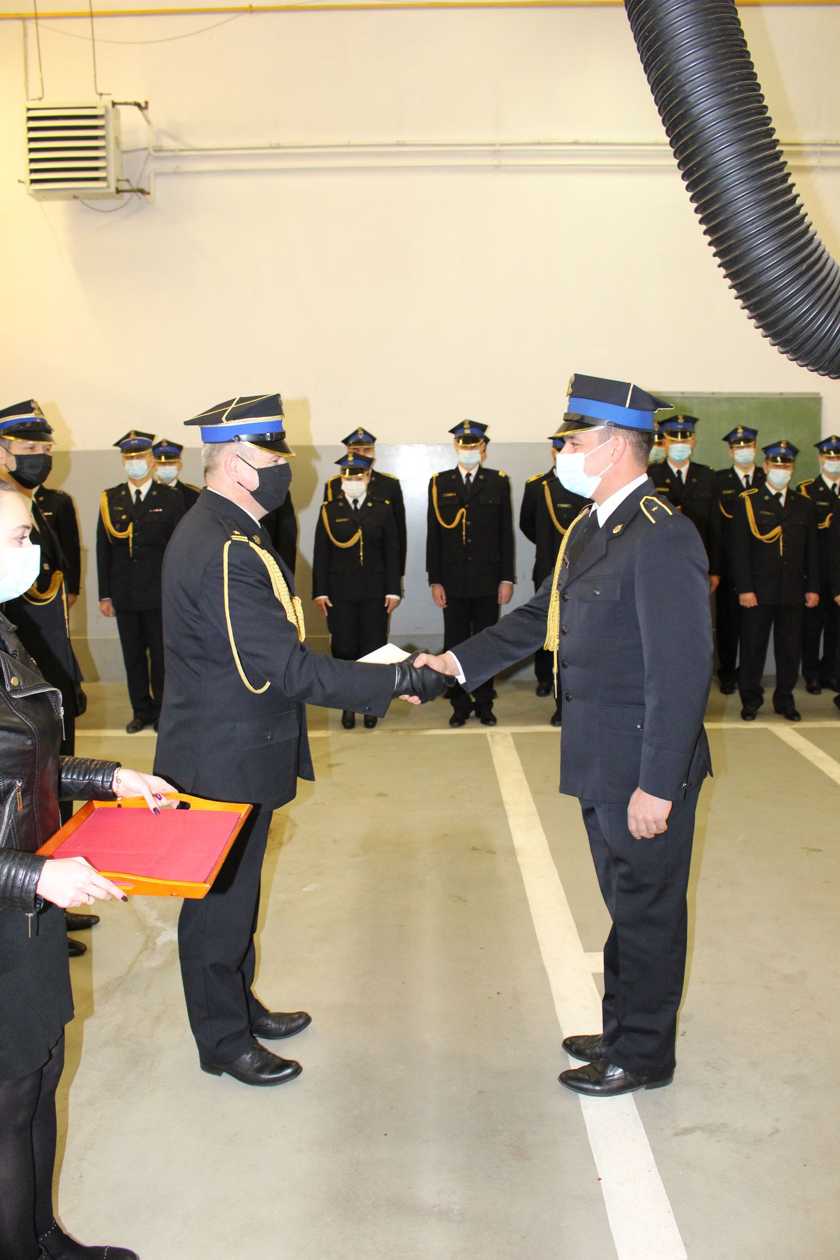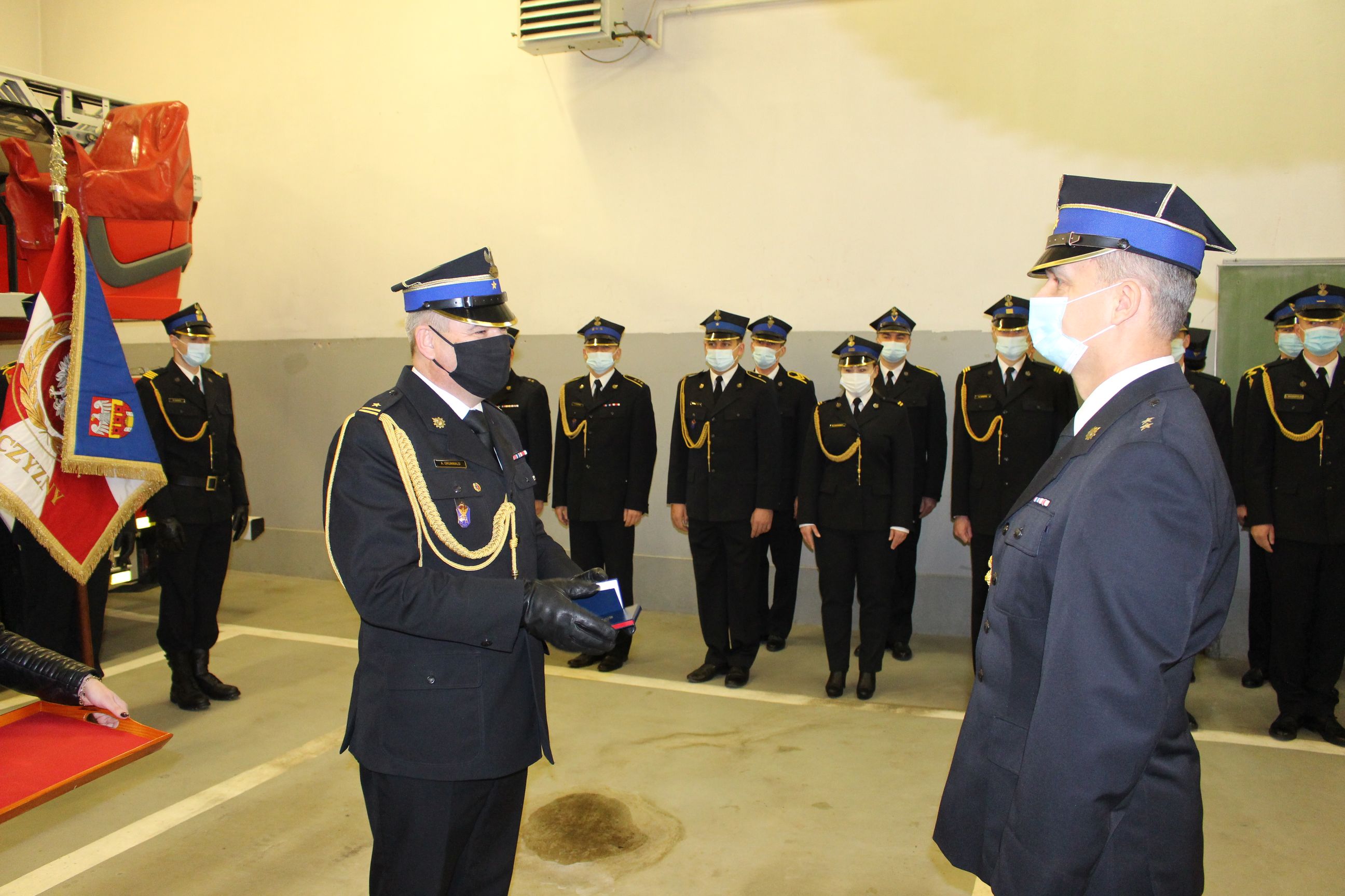 Z uwagi na trwającą pandemię ograniczono ilość osób biorących udział w wydarzeniu. Ceremoniał rozpoczęto złożeniem meldunku przez dowódcę uroczystości st. kpt. Macieja Zwierzykowskiego. Uroczystego wręczenia nadania stopni służbowych oraz odznaczeń dokonali: komendant powiatowy Państwowej Straży Pożarnej w Chodzieży mł. bryg. Adam Grunwald oraz zastępca mł. bryg. Leszek Naranowicz.