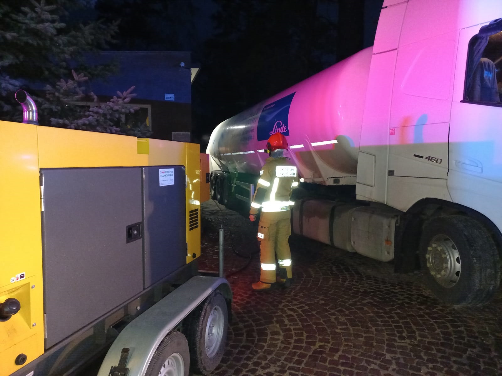 Zadysponowano do zdarzenia zastępy z Jednostki Ratowniczo - Gaśniczej PSP z Chodzieży wraz z przewoźnym agregatem prądotwórczym o dużej mocy należącym do Starostwa Powiatowego w Chodzieży. Działania straży pożarnej polegały na zabezpieczeniu miejsca zdarzenia oraz podłączeniu i uruchomieniu agregatu prądotwórczego w celu wspomagania procesu tankowania ciekłego tlenu medycznego do zbiorników zewnętrznych. Podczas działań przepompowano zostało ok. 2 tony tlenu medycznego. W działaniach trwających niecałą godzinę brały udział 2 zastępy straży pożarnej.