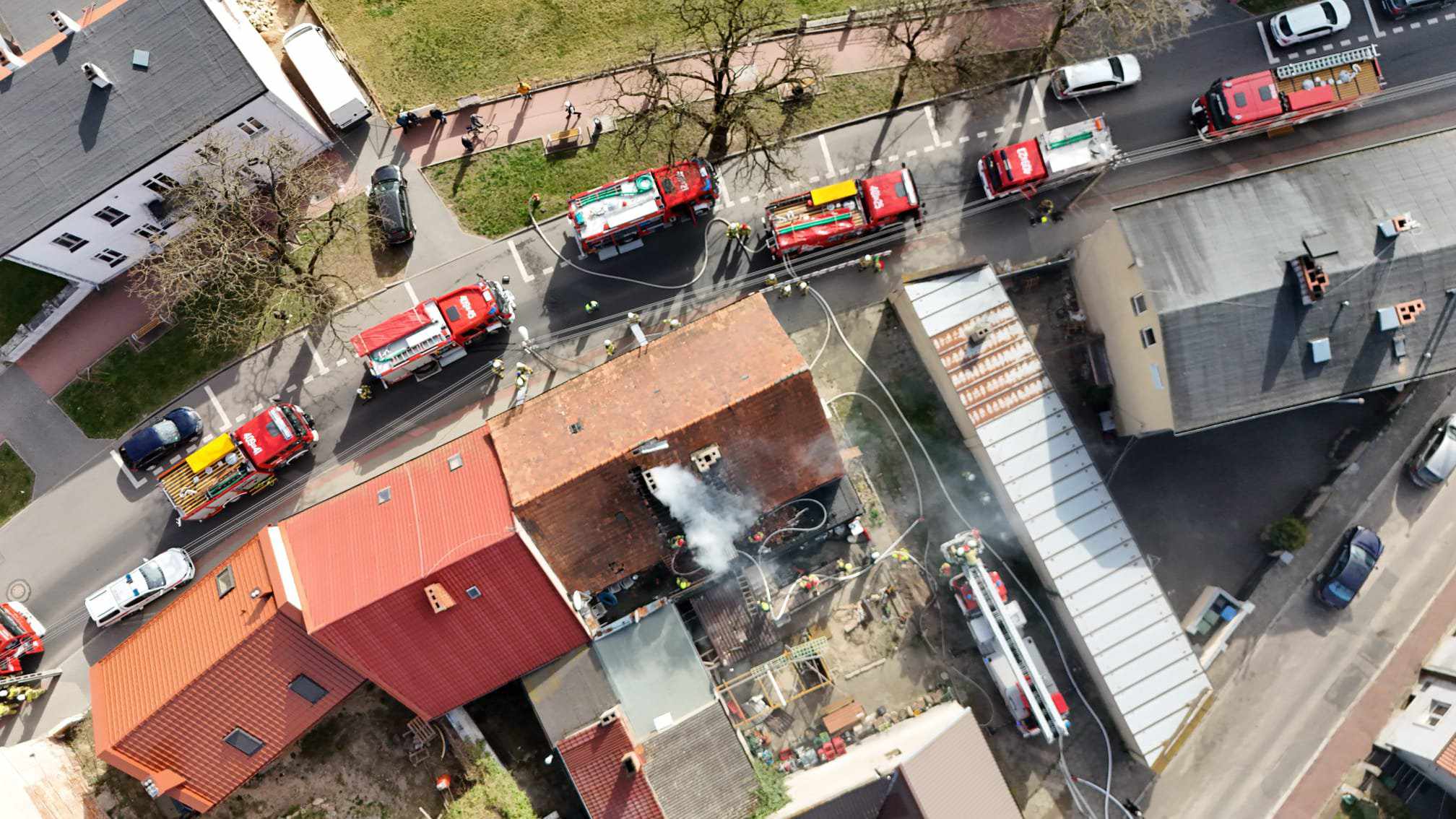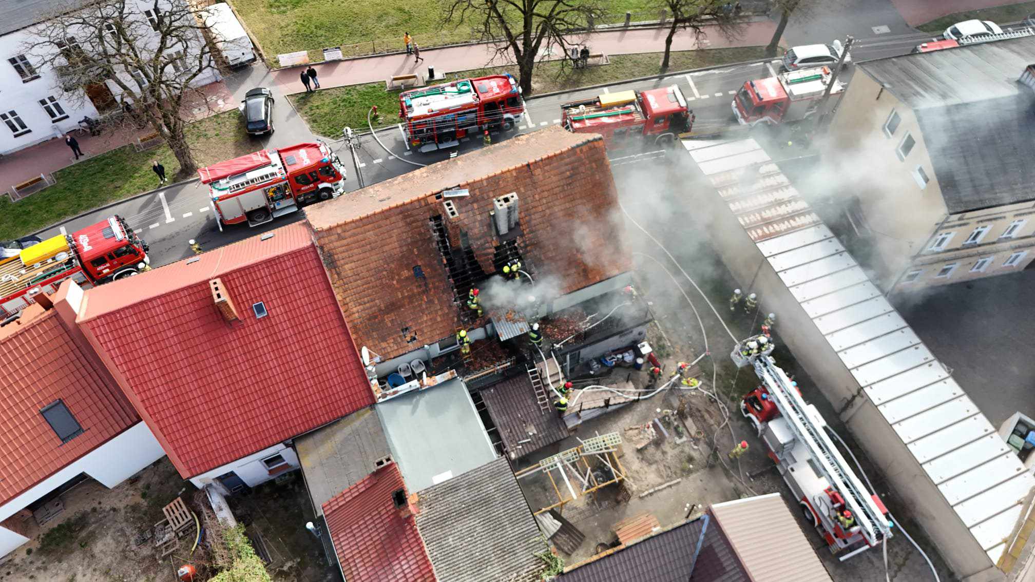 Po przybyciu na miejsce zdarzenia zastępów straży pożarnej stwierdzono, pożar na ulicy Zamkowej w zwartej zabudowie w budynku niskim mieszkalno - usługowym, w którym nikt nie mieszkał i nikt nie przebywał na stałe. Nikt nie został poszkodowany.
