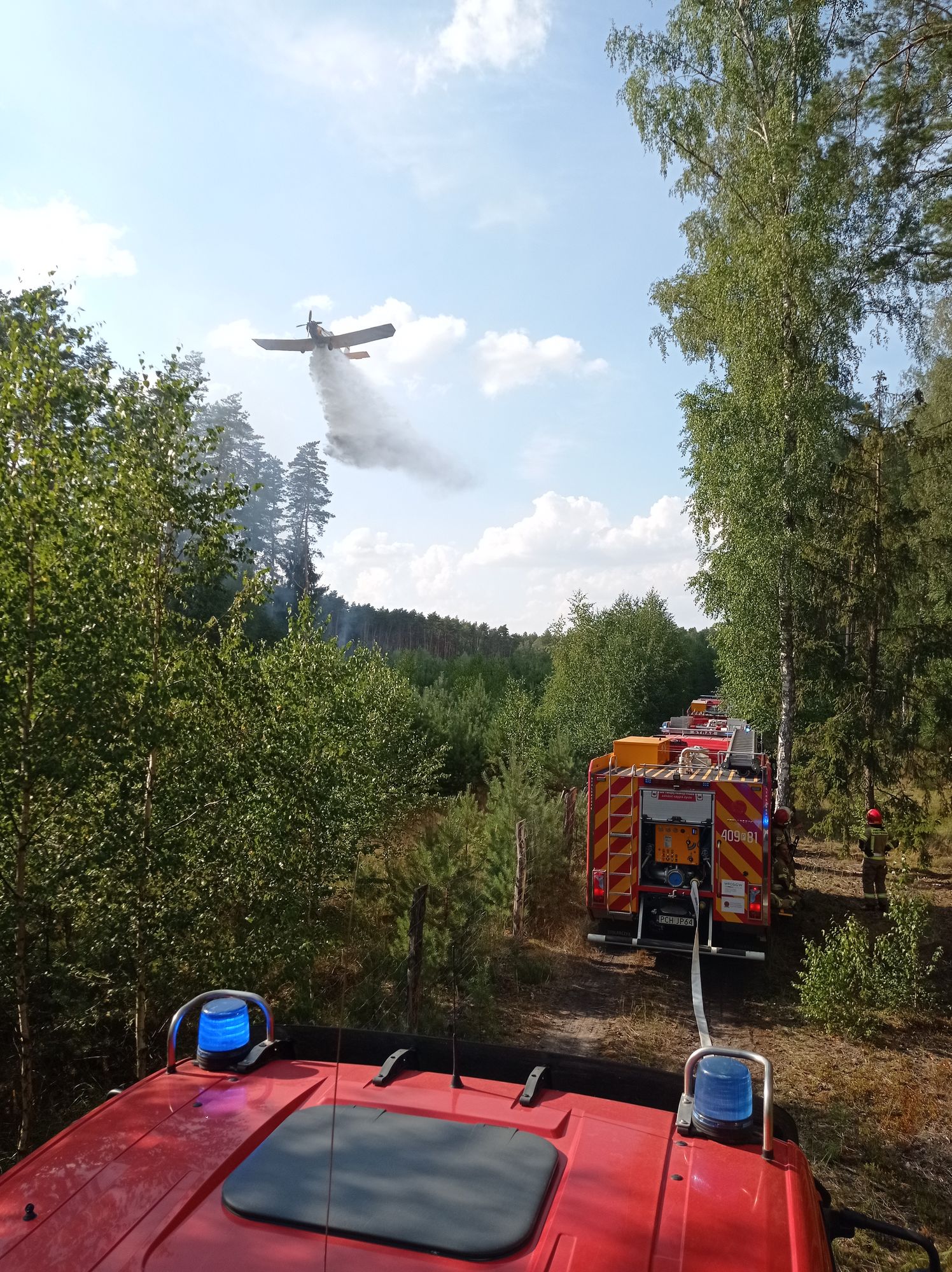 Po przybyciu na miejsce zdarzenia zastępów z straży pożarnej stwierdzono, że pożarem objęte jest prawie pół hektara młodnika – Nadleśnictwo Podanin, Leśnictwo Lipiny. W wyniku pożaru nikt nie został poszkodowany. Działania straży pożarnej w pierwszej kolejności polegały na zabezpieczeniu miejsca zdarzenia i podaniu dwóch prądów wody w natarciu na palący się las. Na miejsce zdarzenia przyleciały dwa samoloty gaśnicze Lasów Państwowych, które dokonały dwa zrzuty wody. Dalsze działania polegały na dogaszaniu pogorzeliska.