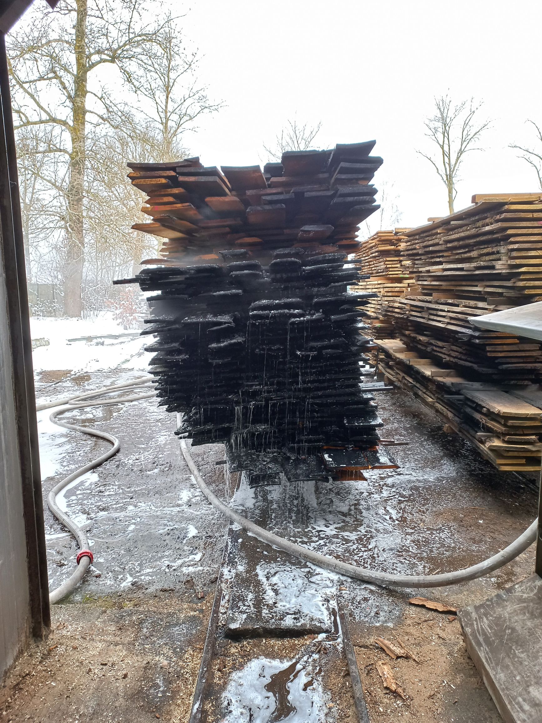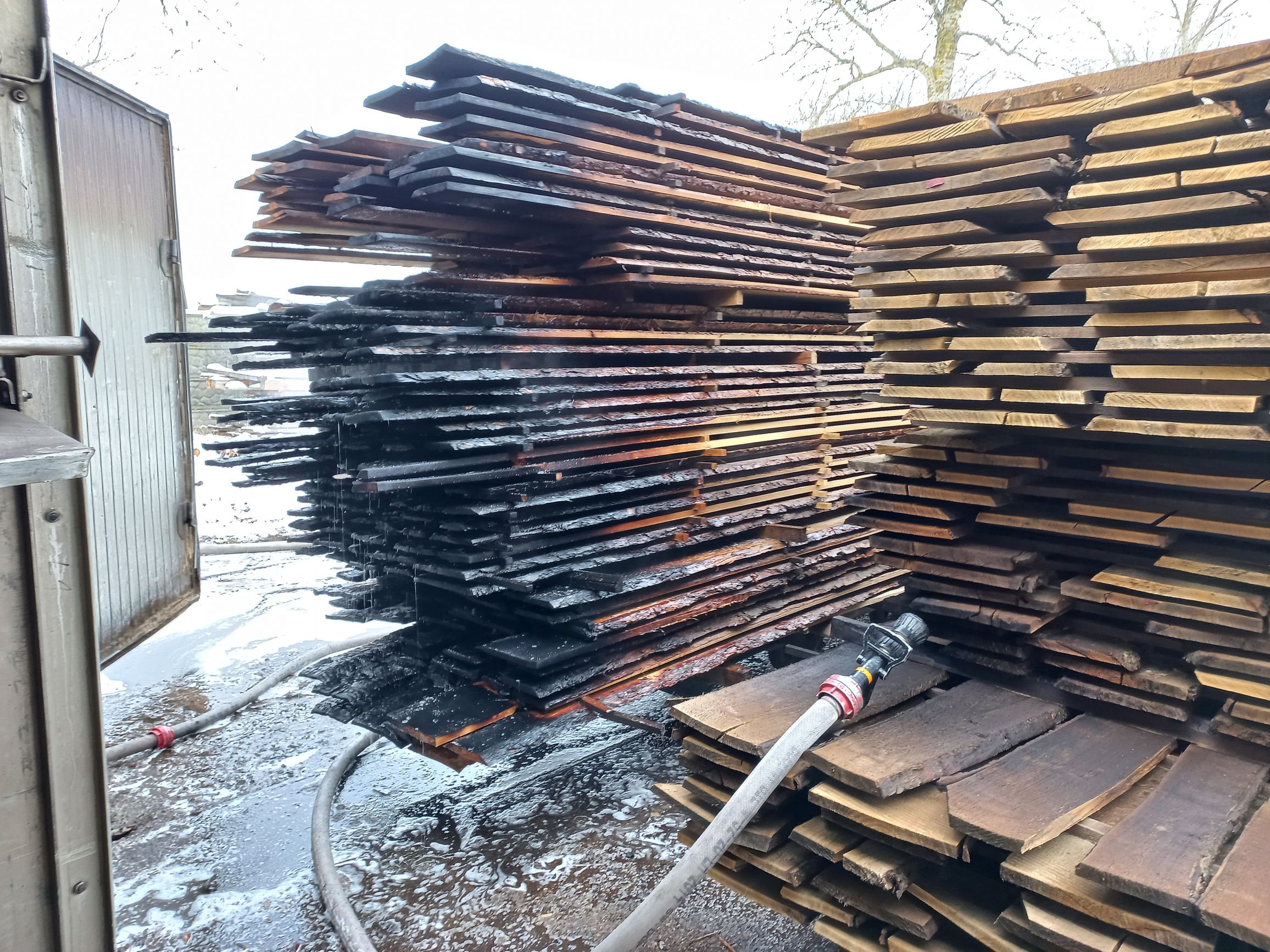 Zastana sytuacja na miejscu zdarzenia przez straż pożarną: na terenie tartaku z jednej suszarni drewna przez otwory wentylacyjne wydobywa się dym, a pracownicy zakładu znajdują się na zewnątrz bez żadnych obrażeń. Działania straży pożarnej w pierwszej kolejności polegały na zabezpieczeniu miejsca zdarzenia oraz podaniu jednego prądu wody w natarciu na palący się sztapel drewna. Dalsze działania polegały na wypchnięciu sztapli znajdujących się na wózkach szynowych na zewnątrz suszarni i dogaszeniu pożaru. W wyniku pożaru spaleniu uległ sztapel drewna oraz pomieszczenie suszarni.