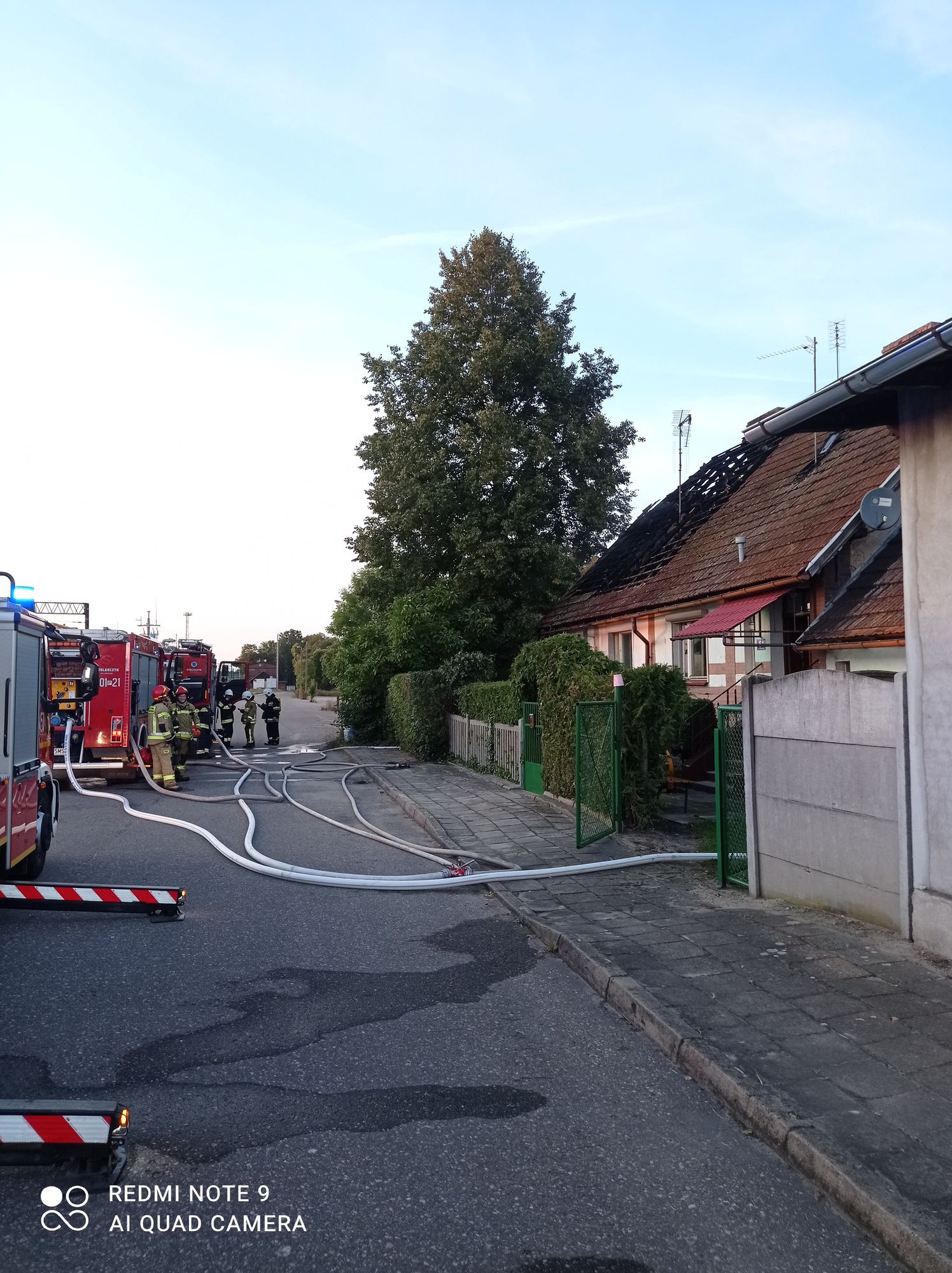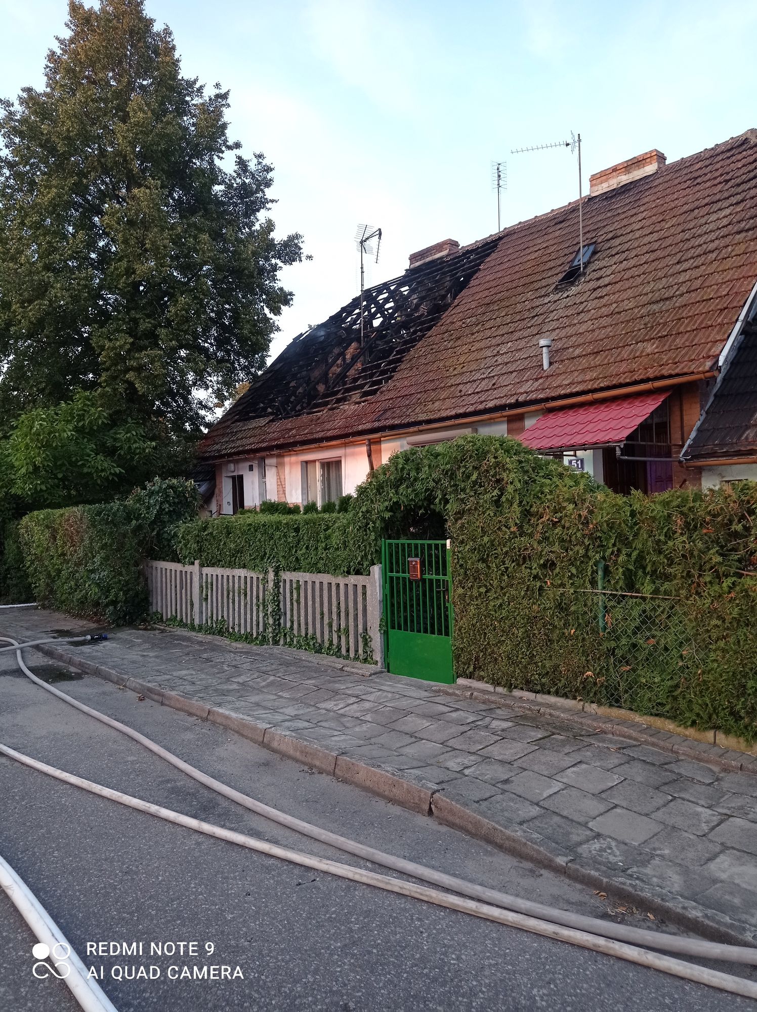 Zastana sytuacja na miejscu zdarzenia przez straż pożarną: pożarem objęte jest poddasze budynku wielorodzinnego (dym wydobywa się z dachu), osoby zamieszkałe w części objętej pożarem znajdują się na zewnątrz - brak osób poszkodowanych.