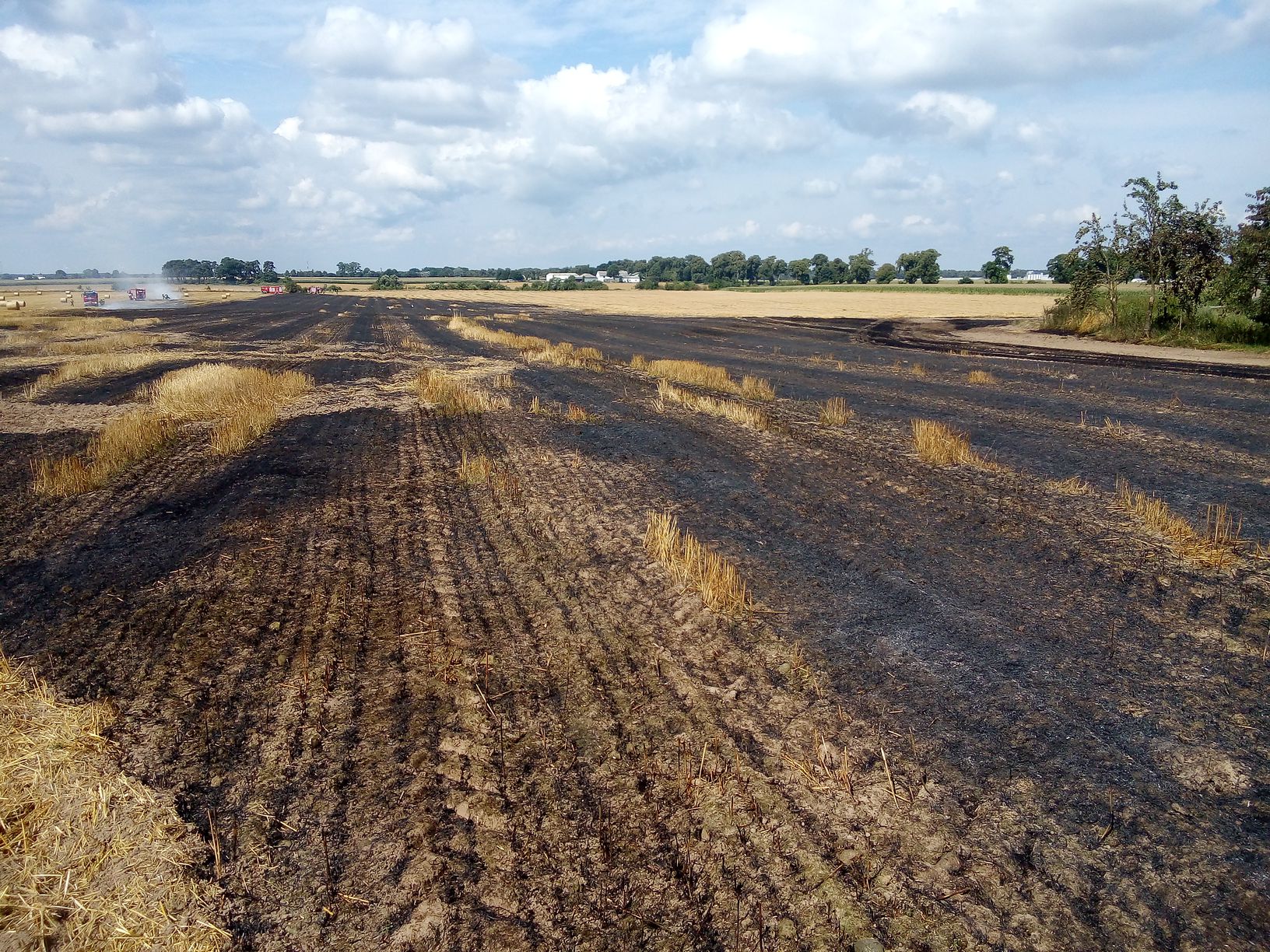 Zastana sytuacja na miejscu zdarzenia przez straż pożarną: pali się słoma po koszeniu, ściernisko na powierzchni około 4 hektarów i 5 balotów słomy, a rolnicy za pomocą dwóch ciągników orzą pole wokół pożaru w celu zatrzymania szybko rozwijającego się pożaru. Działania straży pożarnej w pierwszej kolejności polegały na zabezpieczeniu miejsca zdarzenia oraz podaniu pięciu prądów wody w natarciu na pożar. Pożar udało się szybko zatrzymać i dalsze działania polegały na rozganianiu słomy i dogaszaniu pożaru.