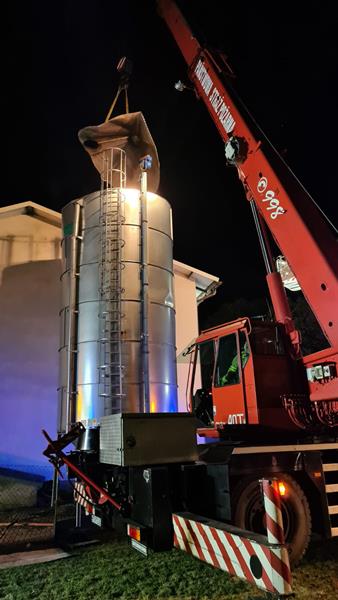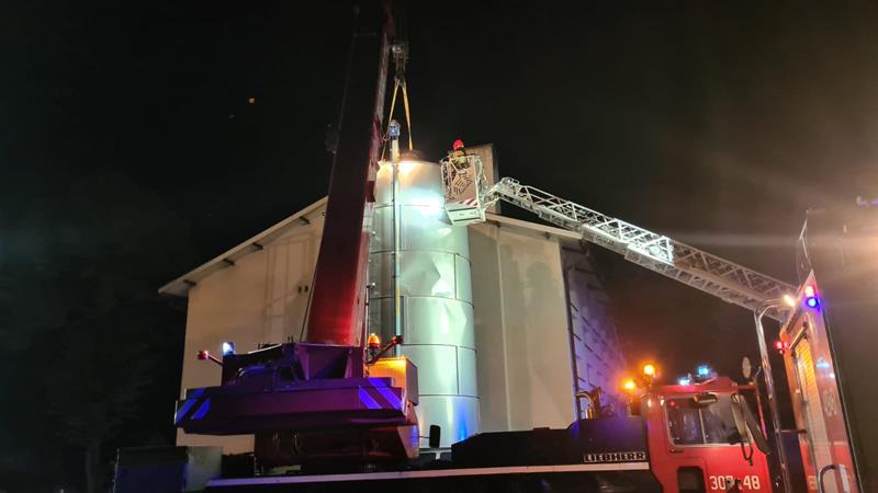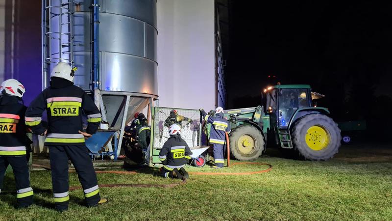 Strażacy przy użyciu kamery termowizyjnej zlokalizowali punktowe źródła ciepła w leju zbiornika, a następnie przez otwory rewizyjne podali prąd wody za pomocą lancy gaśniczej. Następnie wykonano większe otwory, celem usunięcia spalonej zwartości z dna silosu. W trakcie prac doszło do wybuchu, który uszkodził dach i miejscowo odkształcił ściany silosu. Na szczęście nikt nie został poszkodowany. Prace wstrzymano ze względu na możliwe powtórzenie się sytuacji, do czasu zdjęcia uszkodzonego dachu oraz potencjalne zagrożenie ratowników. W tym celu zadysponowano Specjalistyczną Grupę Ratownictwa Technicznego z dźwigiem, z JRG 7 z Poznania. Po zdjęciu dachu wznowiono opróżnianie zbiornika. Działania trwały prawie do godziny 10:00 dnia następnego.