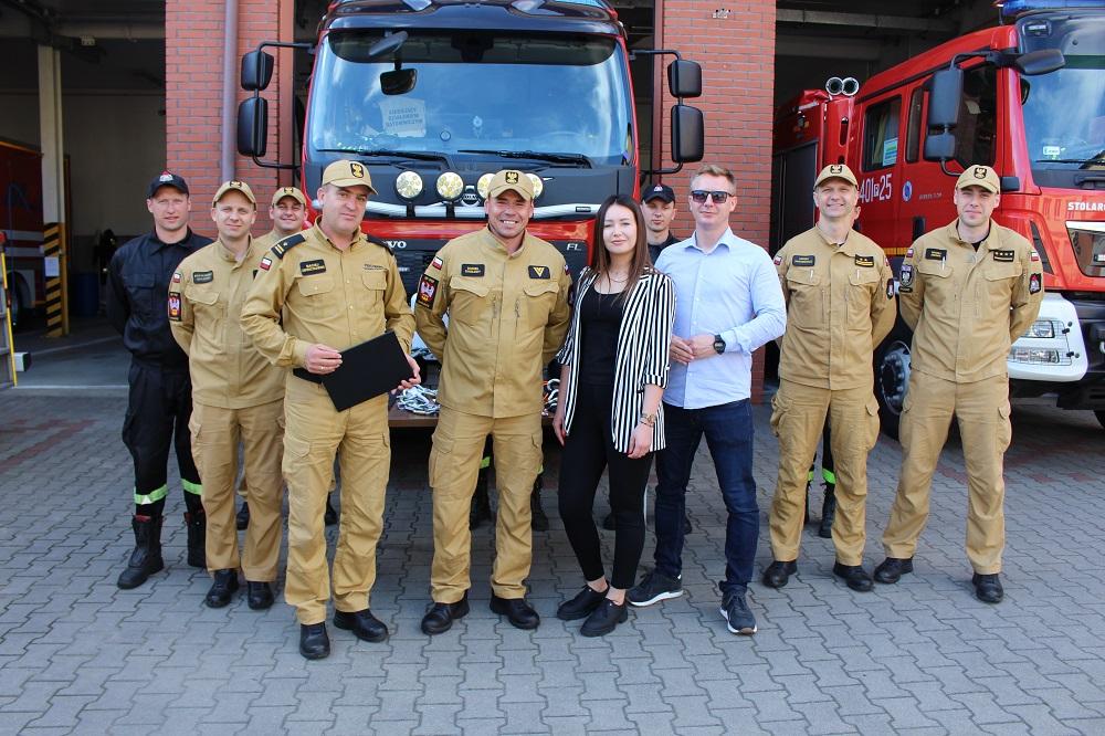 Komendant Powiatowy podziękował zarządowi firmy za bardzo dobrą współpracę i złożył osobiste podziękowania na ręce Pana Przemysława Szamkuć dyrektora zarządzającego firmą MODEUNG Elektronics Poland oraz Pani Patrycji Wałcerz specjalistce ds. administracji, za wsparcie chodzieskiej komendy w w/w sprzęt ratowniczy.