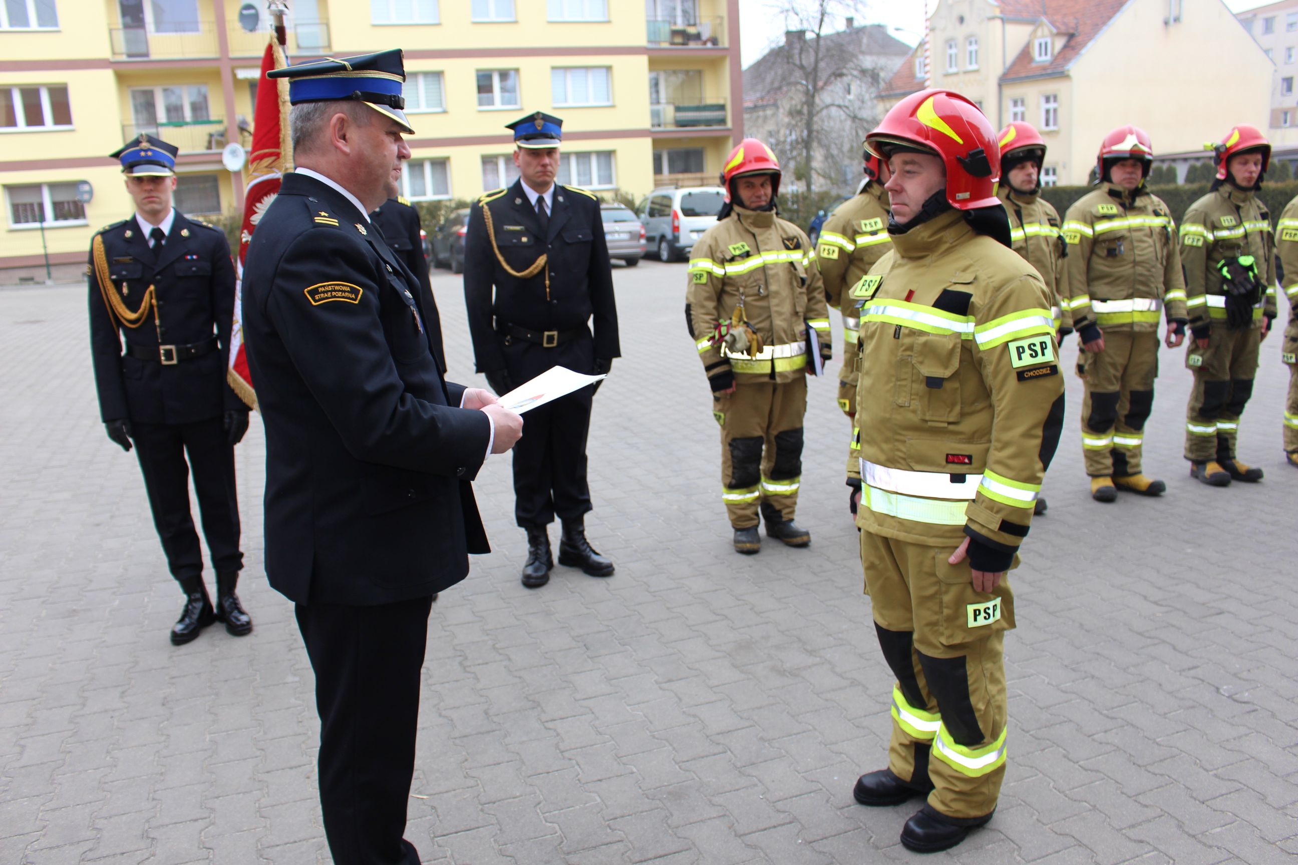 Na placu Komendy Powiatowej Państwowej Straży Pożarnej w Chodzieży str. Piotr Jędrzejczyk złożył ślubowanie w obecności funkcjonariuszy i pracowników cywilnych KP PSP z Komendantem Powiatowym Państwowej Straży Pożarnej w Chodzieży mł. bryg. Adamem Grunwaldem. Komendant Powiatowy PSP w Chodzieży złożył gratulacje dla nowego adepta sztuki pożarniczej i życzył mu szybkiego przyswajania nowych wiadomości i umiejętności, awansów oraz tego, by to co do tej pory było marzeniem, teraz stało się spełnieniem planów i zamierzeń.