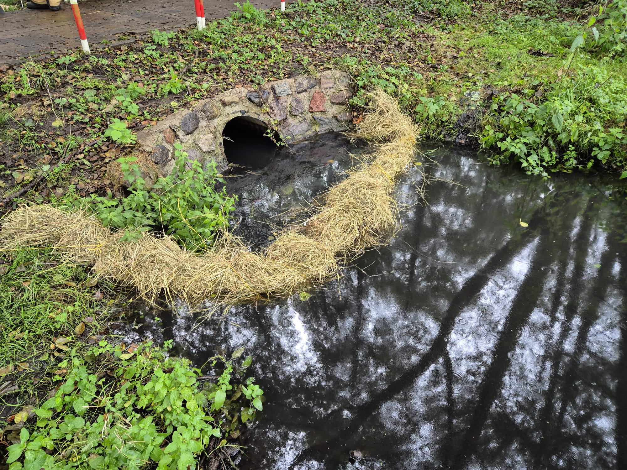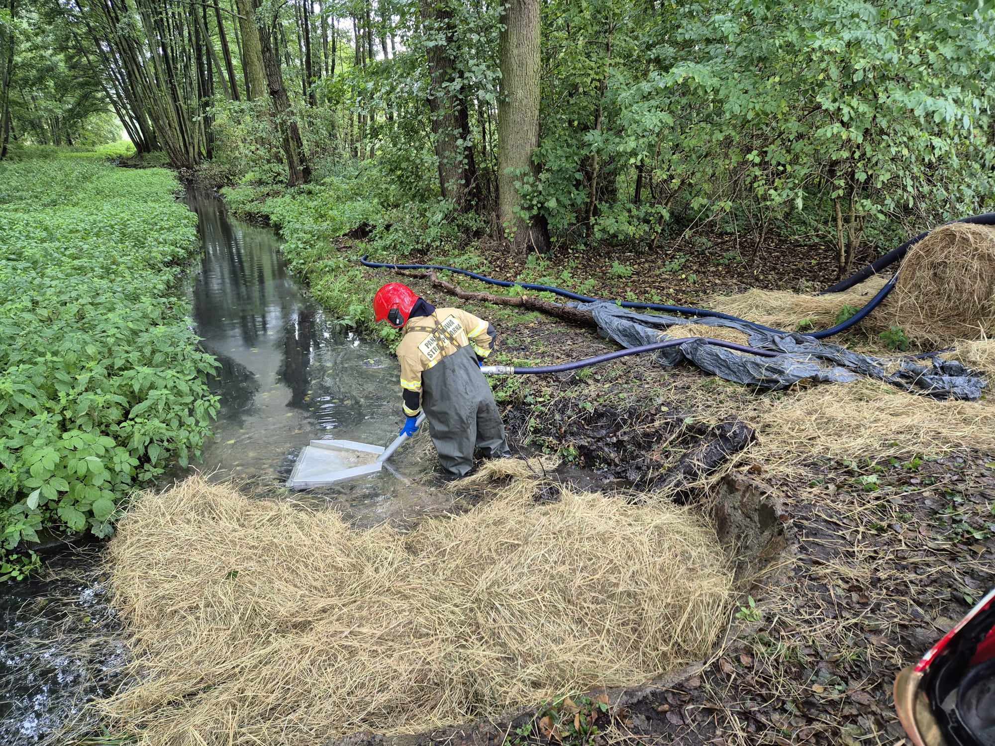 Działania straży pożarnej polegały na zabezpieczeniu miejsca zdarzenia, ustawienie na rowie melioracyjnym dwóch zapór w formie balotów słomy i siana w celu zabezpieczenia przed przedostawaniem się substancji ropopochodnej do jeziora Miejskiego, sprawdzenie terenu w górę rowu melioracyjnego pod kątem możliwości dostania się szkodliwej substancji do wody - nie stwierdzono miejsca dostawania się substancji.