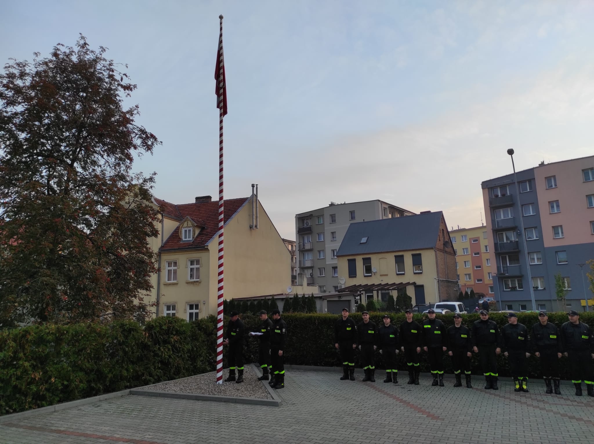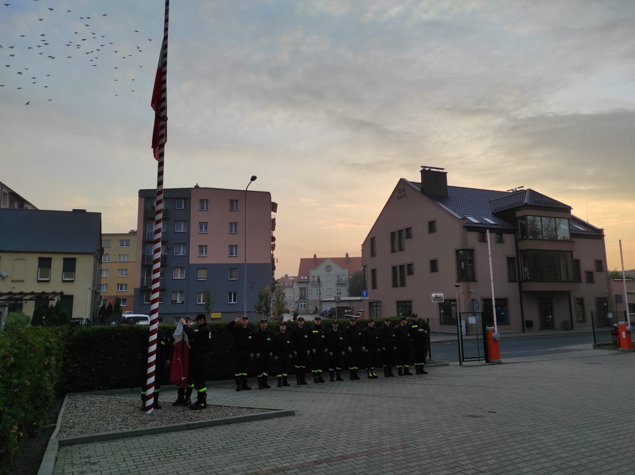 Na placu Komendy Powiatowej Państwowej Straży Pożarnej w Chodzieży, w dniu 14 października 2022 roku o godzinie 8:00, przyjmująca zmiana służbowa uroczyście podniosła flagę państwową na maszt.