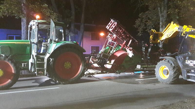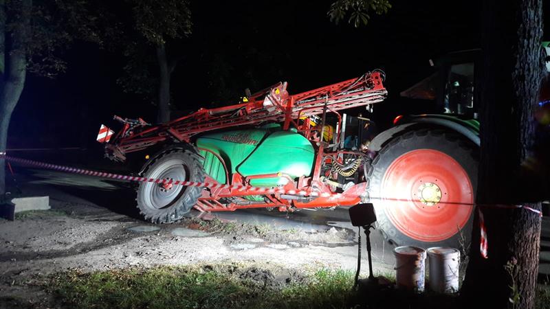 Ratownicy pracujący w strefie przepompowali ciecz z uszkodzonego opryskiwacza do drugiego podstawionego opryskiwacza.