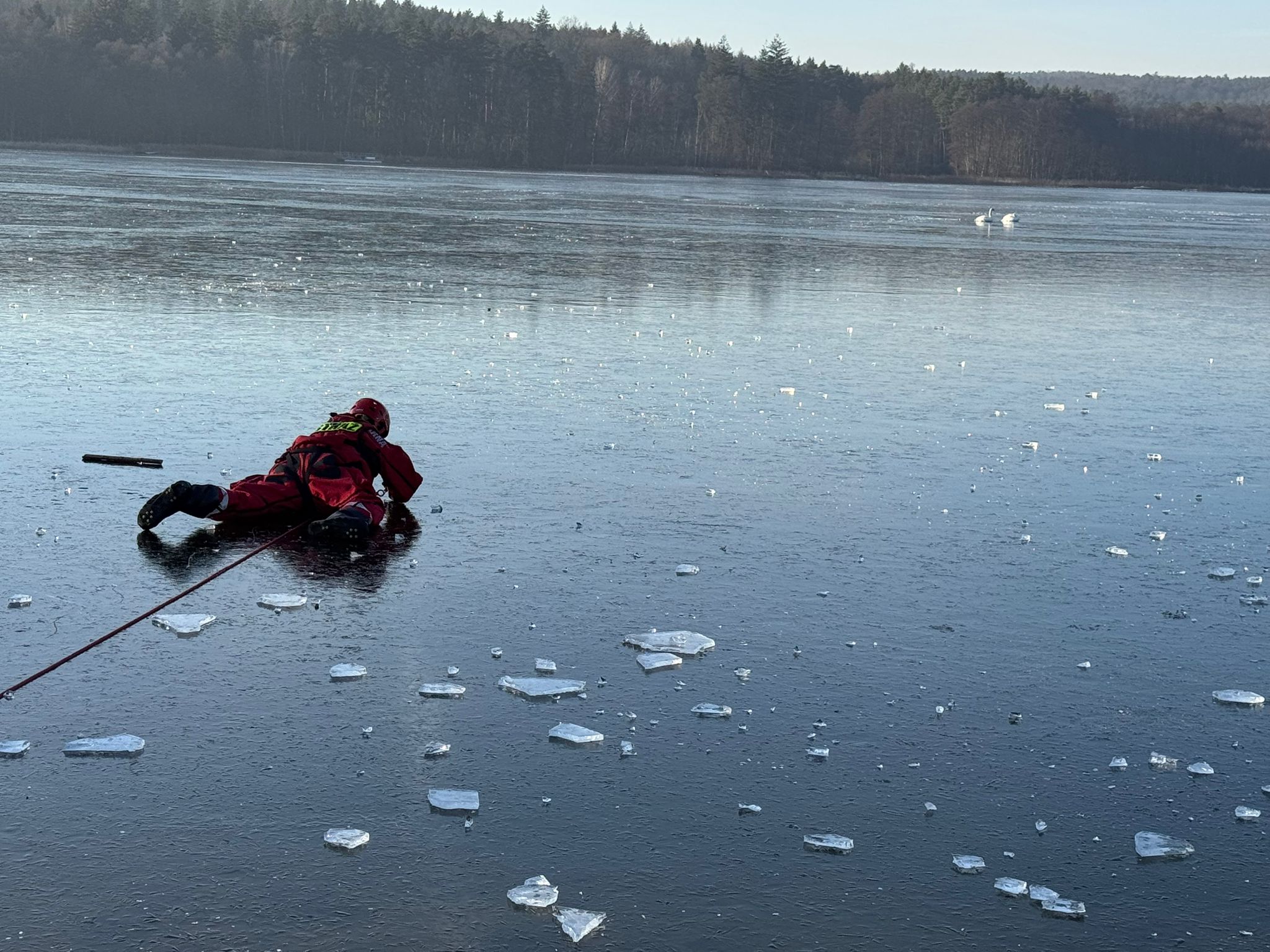 - Pamiętaj! Najważniejsze jest własne bezpieczeństwo. Jeśli lód załamał się pod osobą poszkodowaną, może załamać się również pod Tobą. Dlatego tak ważne jest wezwanie pomocy profesjonalistów. Ratownik bez odpowiedniego zabezpieczenia może przebywać w zimnej wodzie krótko. Po 3. minutach dochodzi do wyziębienia organizmu.