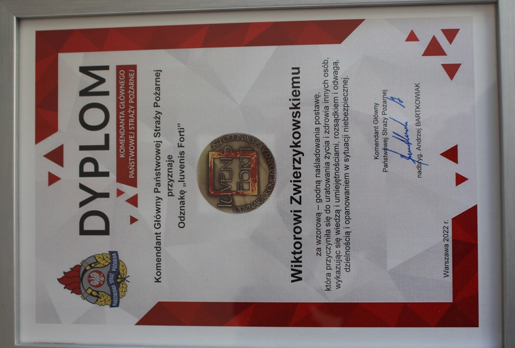 W dniu 23 marca br., w chodzieskiej komendzie miała ona uroczysty charakter, ze względu na wręczenie Wiktorowi Zwierzykowskiemu odznaki „Iuvenis Forti”, który pomógł odnaleźć zaginionego mężczyznę, podczas poprowdzonych poszukiwań 7 lutego br.
