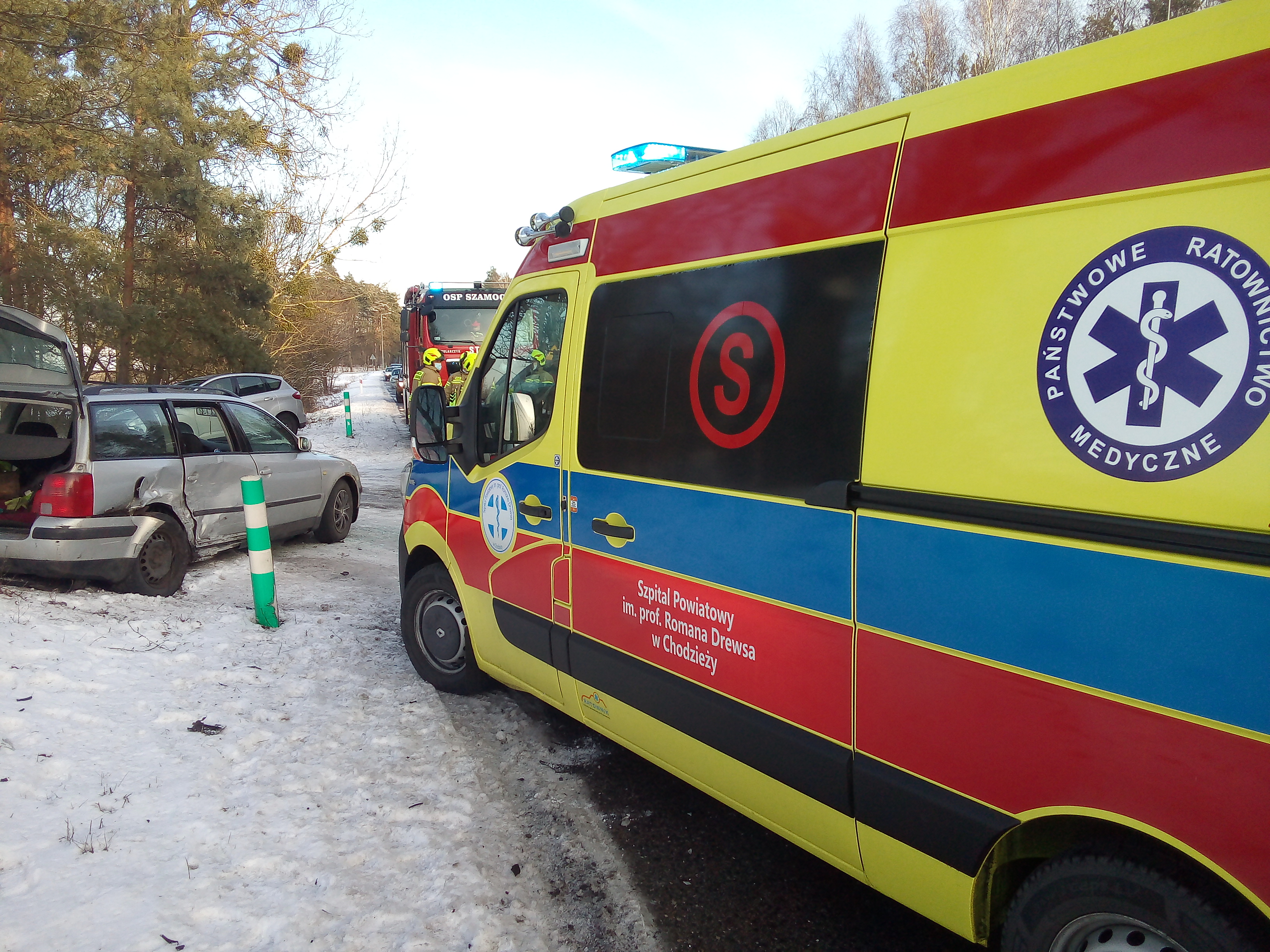 Zadysponowano zastępy z Jednostki Ratowniczo - Gaśniczej PSP z Chodzieży, OSP KSRG Szamocin, Policję oraz ambulans Państwowego Ratownictwa Medycznego. Po przybyciu na miejsce zdarzenia stwierdzono, że na skrzyżowaniu drogi wojewódzkiej z droga gminną stoją dwa uszkodzone samochody osobowe. W pojazdach podróżowały cztery osoby, w tym kobieta w ciąży.