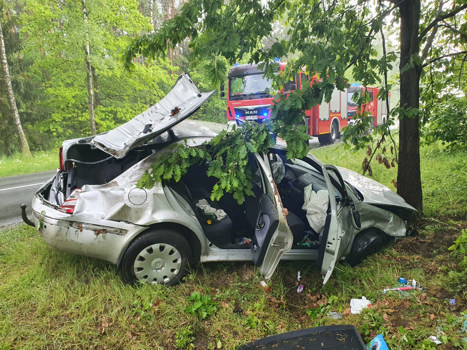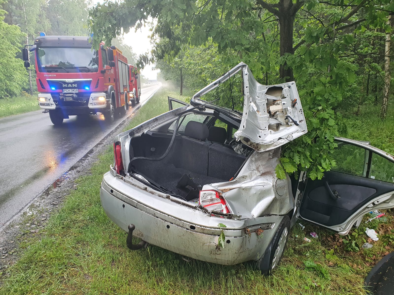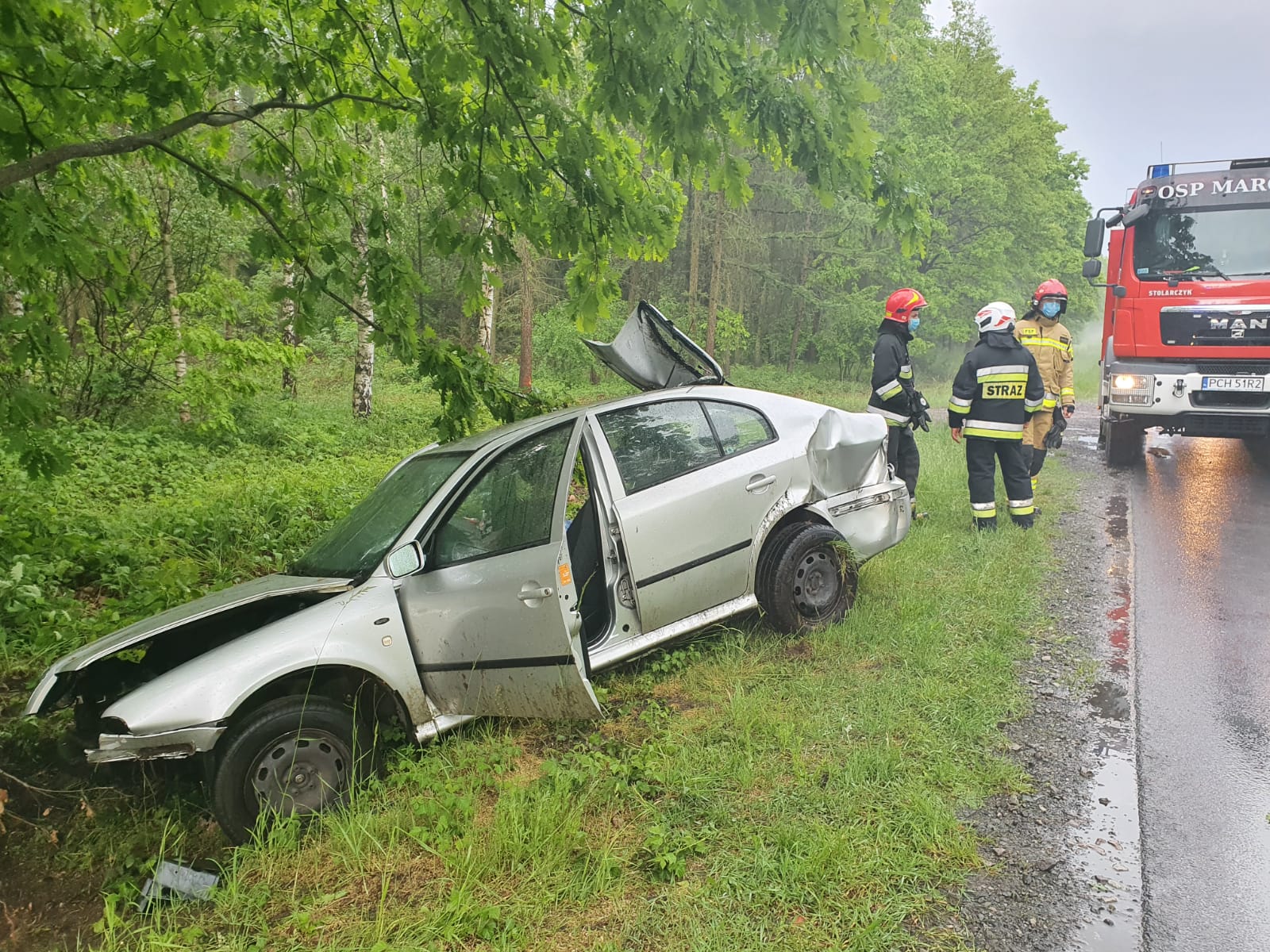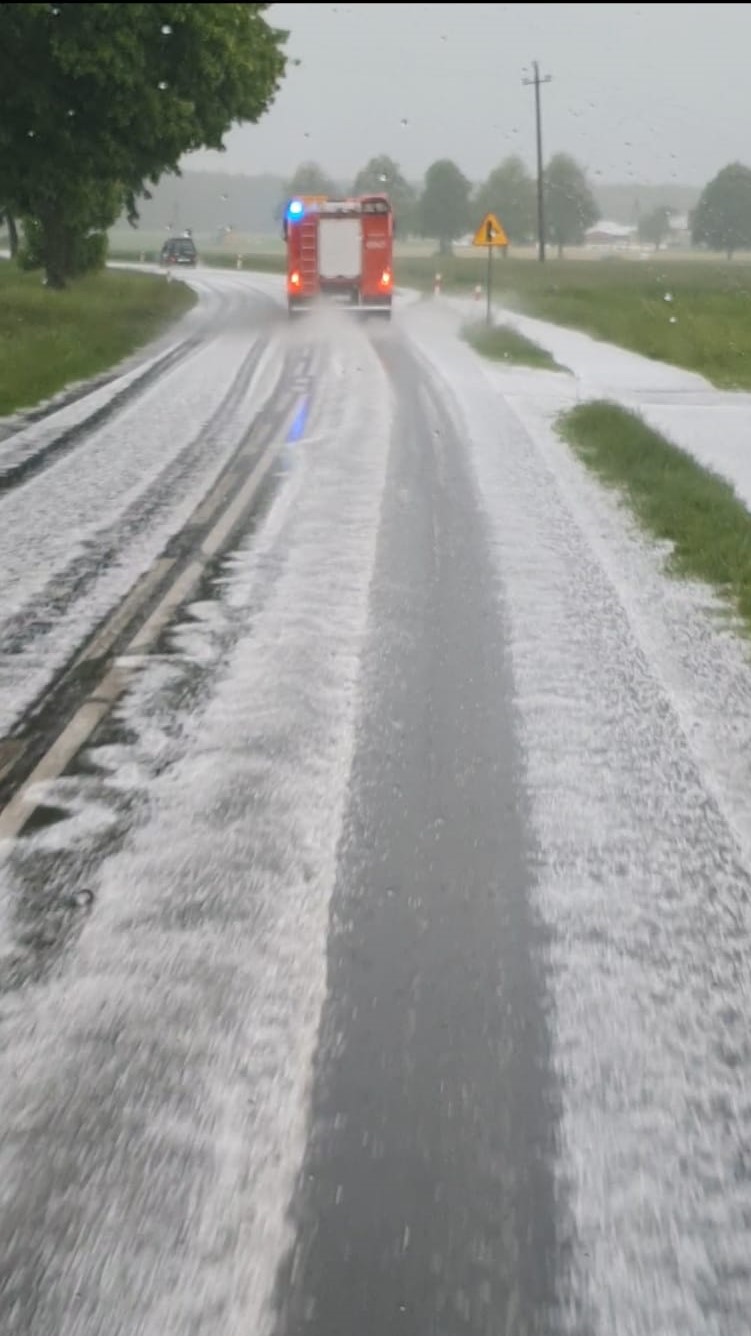 Działania straży pożarnej polegały na: zabezpieczeniu miejsca zdarzenia, odłączeniu akumulatora w samochodzie, udzieleniu wsparcia psychicznego dla poszkodowanego do czasu przybycia na miejsce zdarzenia ZRM – poszkodowany nie został przewieziony do szpitala. Podczas działań ruch na drodze odbywał się wahadłowo. Utrudnienia w dojeździe: śliska nawierzchnia drogi w wyniku intensywnego opadu gradu.