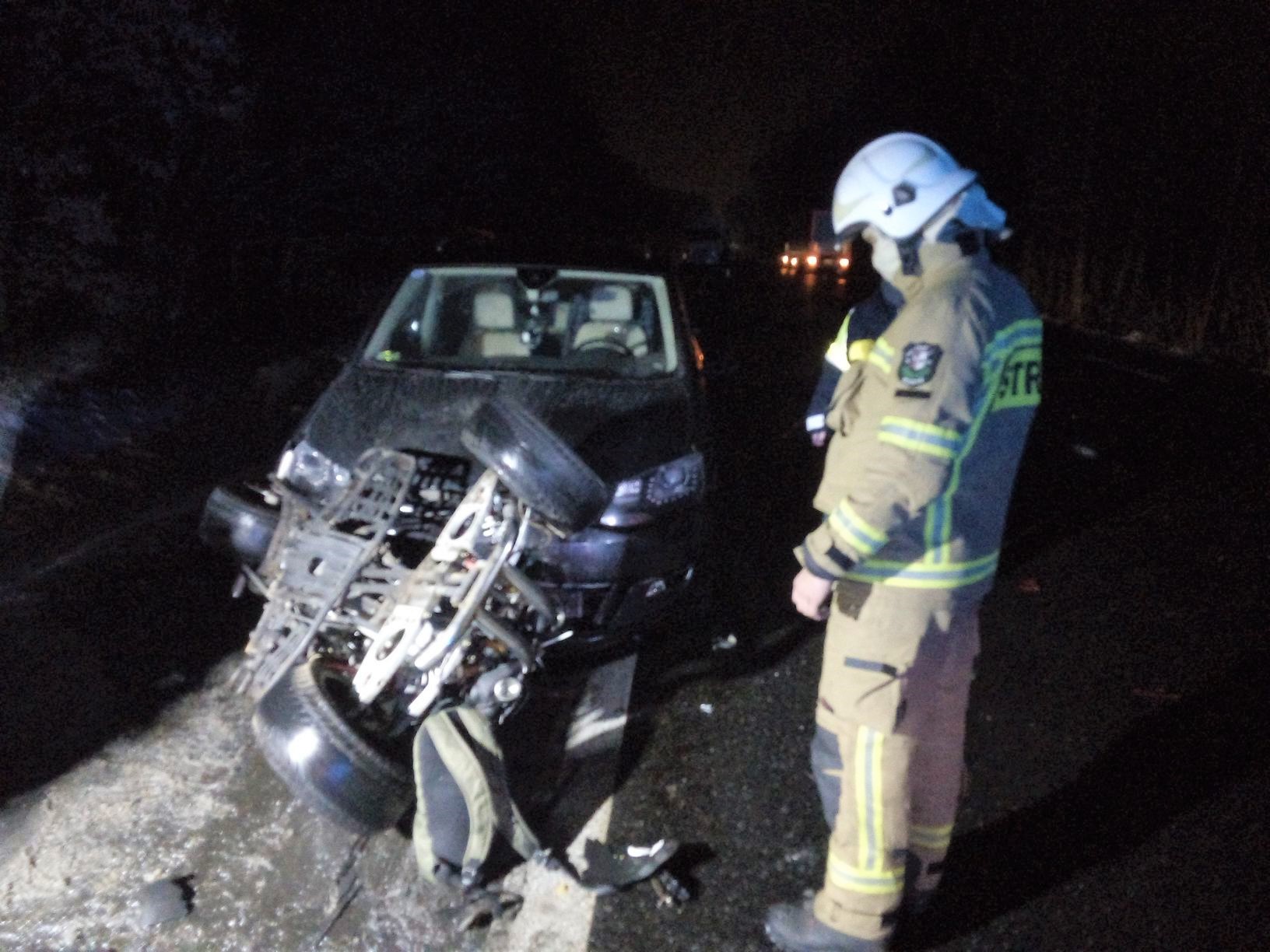 Zadysponowano zastępy z Jednostki Ratowniczo - Gaśniczej PSP z Chodzieży, z OSP KSRG Budzyń, Policję oraz Zespół Ratownictwa Medycznego. Po przybyciu na miejsce zdarzenia pierwszego zastępu straży pożarnej stwierdzono, że prowadzona jest resuscytacja krążeniowo – oddechowa (RKO) osobie poszkodowanej leżącej na jezdni przez Zespół Ratownictwa Medycznego (wracający ze zdarzenia w Budzyniu). Trójkołowiec wbity jest w przód pojazdu osobowego - podróżujące w samochodzie osobowym dwie osoby znajdują się na zewnątrz bez obrażeń, DK-11 jest całkowicie zablokowana. Działania jednostek ochrony przeciwpożarowej polegały w pierwszej kolejności na zabezpieczeniu i oświetleniu miejsca zdarzenia, pomoc ZRM w prowadzeniu RKO oraz rozstawienie parawanu celem osłonięcia miejsca zdarzenia. Poszkodowany w ciężkim stanie został przetransportowany przez ambulans do szpitala. Uszkodzone pojazdy zostały zabrane przez pomoc drogową. W trakcie działań droga była całkowicie zablokowana.