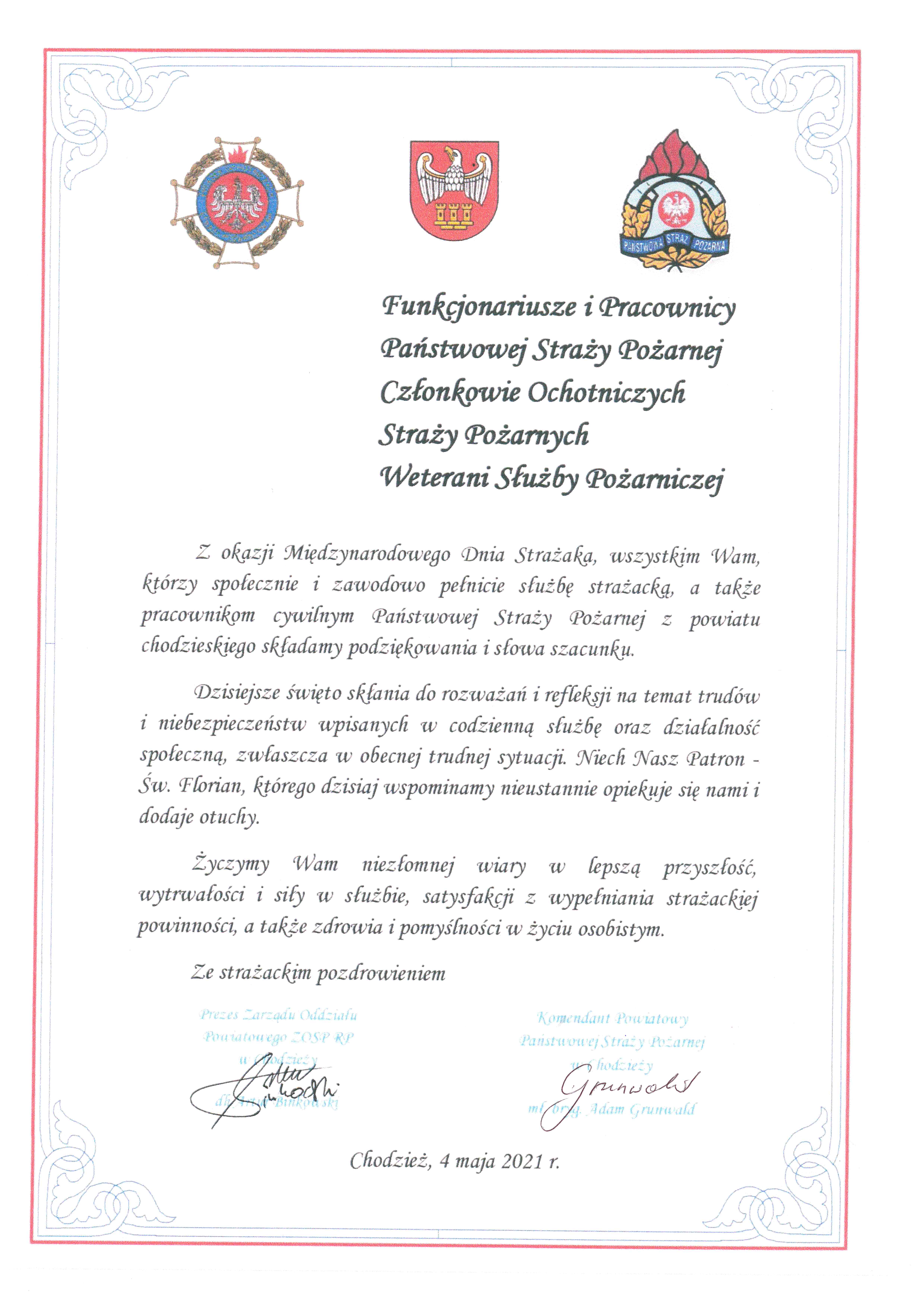 ŻYCZENIA KOMENANTA POWIATOWEGO PSP ORAZ PREZESA ZARZĄDU ODDZIAŁU POWIATOWEGO ZOSP RP Z OKAZJI DNIA STRAŻAKA