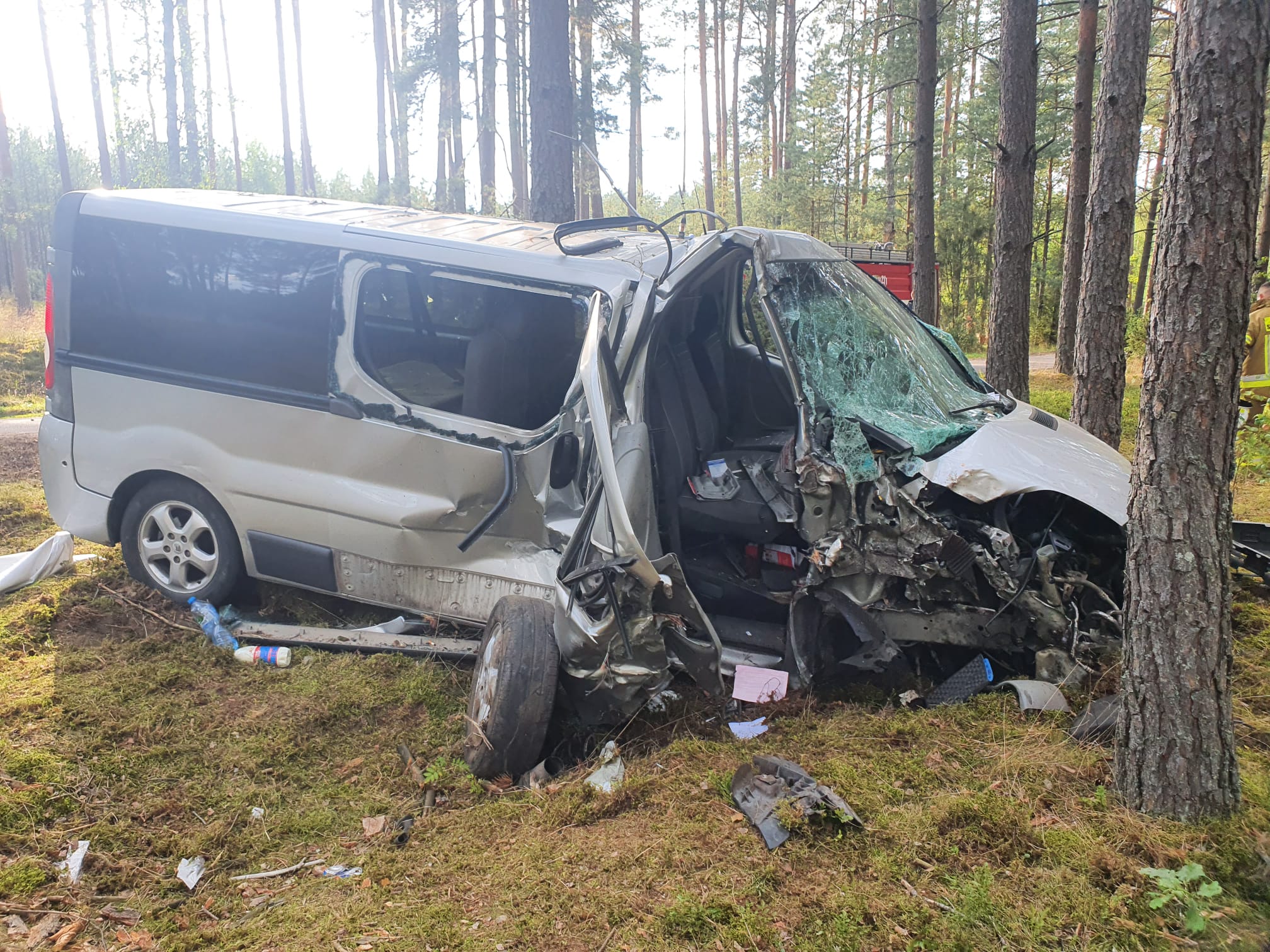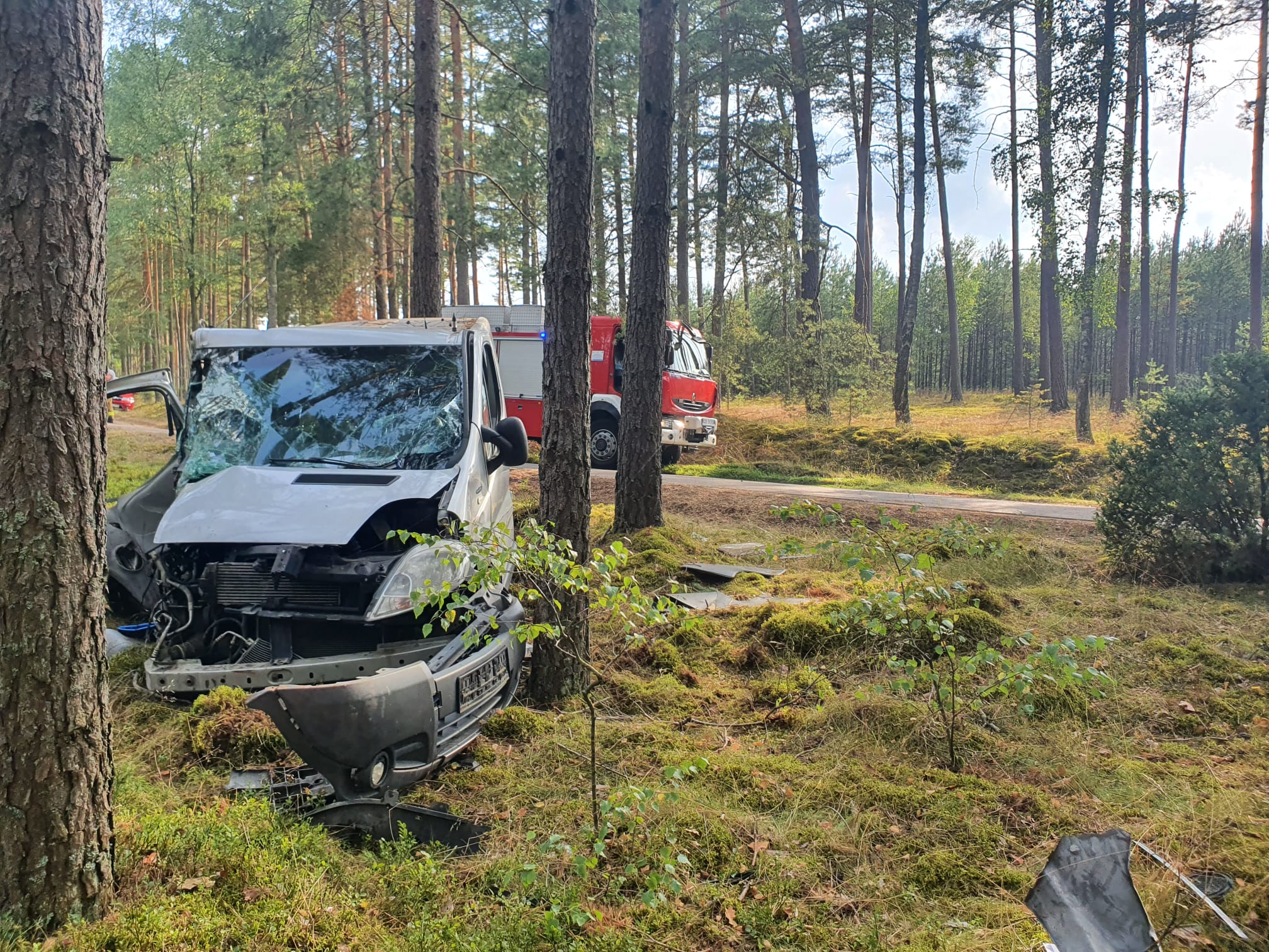 Po przybyciu na miejsce zdarzenia pierwszych zastępów stwierdzono, że samochód osobowy, którym podróżowało osiem osób na łuku wypadł z drogi i uderzył w drzewo, informacja o osobach zakleszczonych nie potwierdziła się, wszyscy znajdowali się poza pojazdem. Uczestnicy zdarzenia zostali wstępnie zaopatrzenia przez załogę karetki pogotowia, która najechała na zdarzenie przed przybyciem Jednostek Ochrony Przeciwpożarowej. Ruch w miejscu wypadku został całkowicie zablokowany.