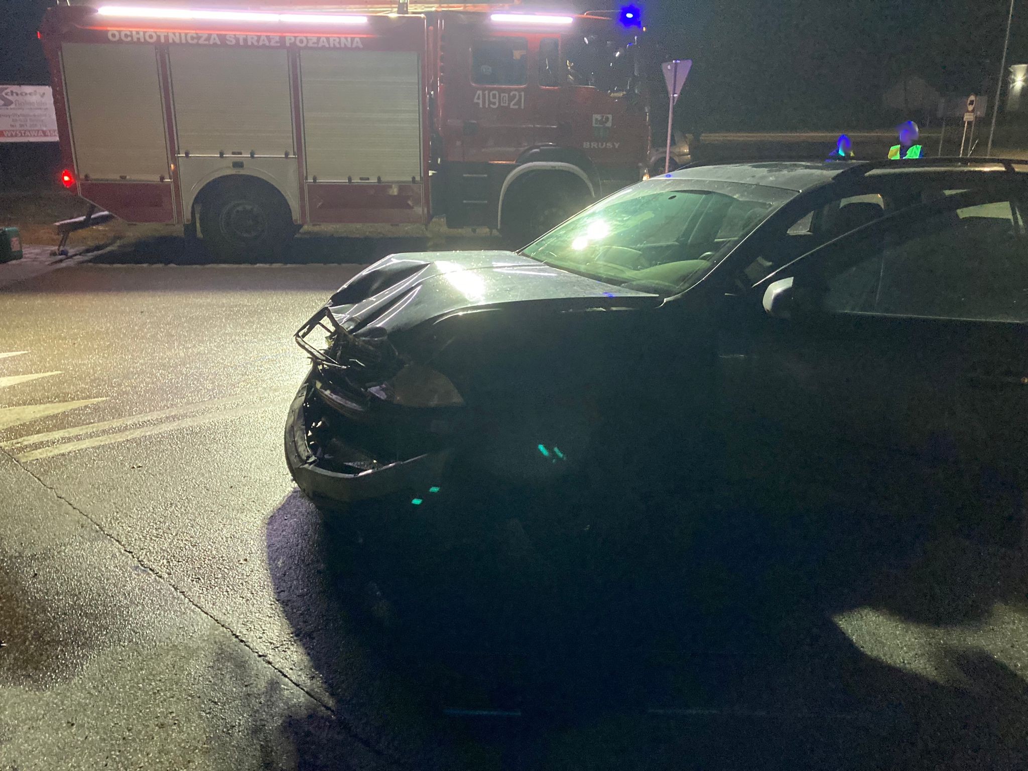 Po przybyciu zastępu na miejsce zdarzenia stwierdzono że, na drodze wojewódzkiej w miejscowości Brusy Wybudowanie doszło do zderzenia dwóch samochodów osobowych.