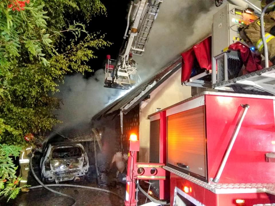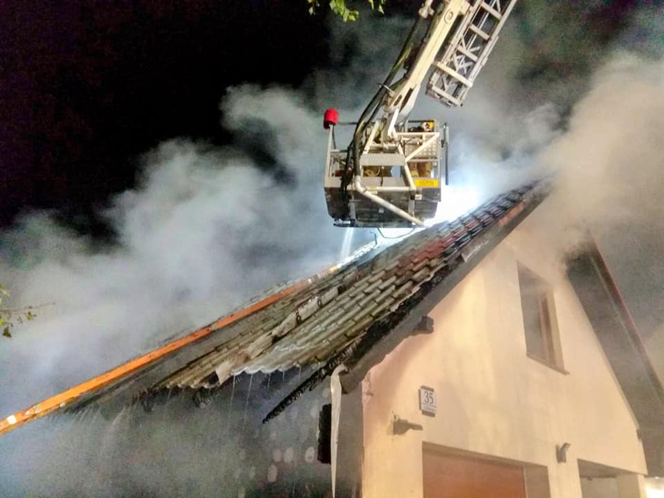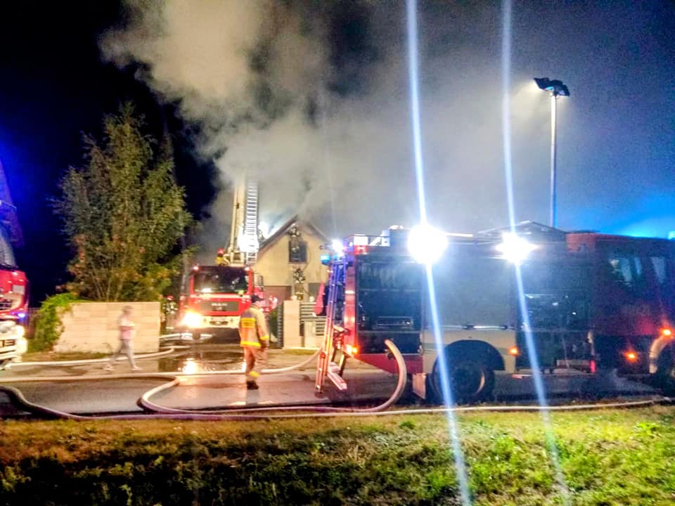 Działania Jednostek Ochrony Przeciwpożarowej Działania polegały na zabezpieczeniu miejsca zdarzenia, po rozpoznaniu 360 st., podanie pięciu prądów wody. W trakcie działań konieczne było zdjęcie całej blacho dachówki z dachu, ponieważ pożar znajdował się w przestrzeni pomiędzy blachą a płytami OSB. Równocześnie gaszono samochód osobowy oraz skład drewna opałowego. Zbiornik z gazem nie uległ uszkodzeniu i nagrzaniu. Po oddymieniu pomieszczeń sprawdzono kamerą je termowizyjną. Cały budynek i obszar przyległy przeszukano. Na dozór pogorzeliska pozostały zastępy OSP.
