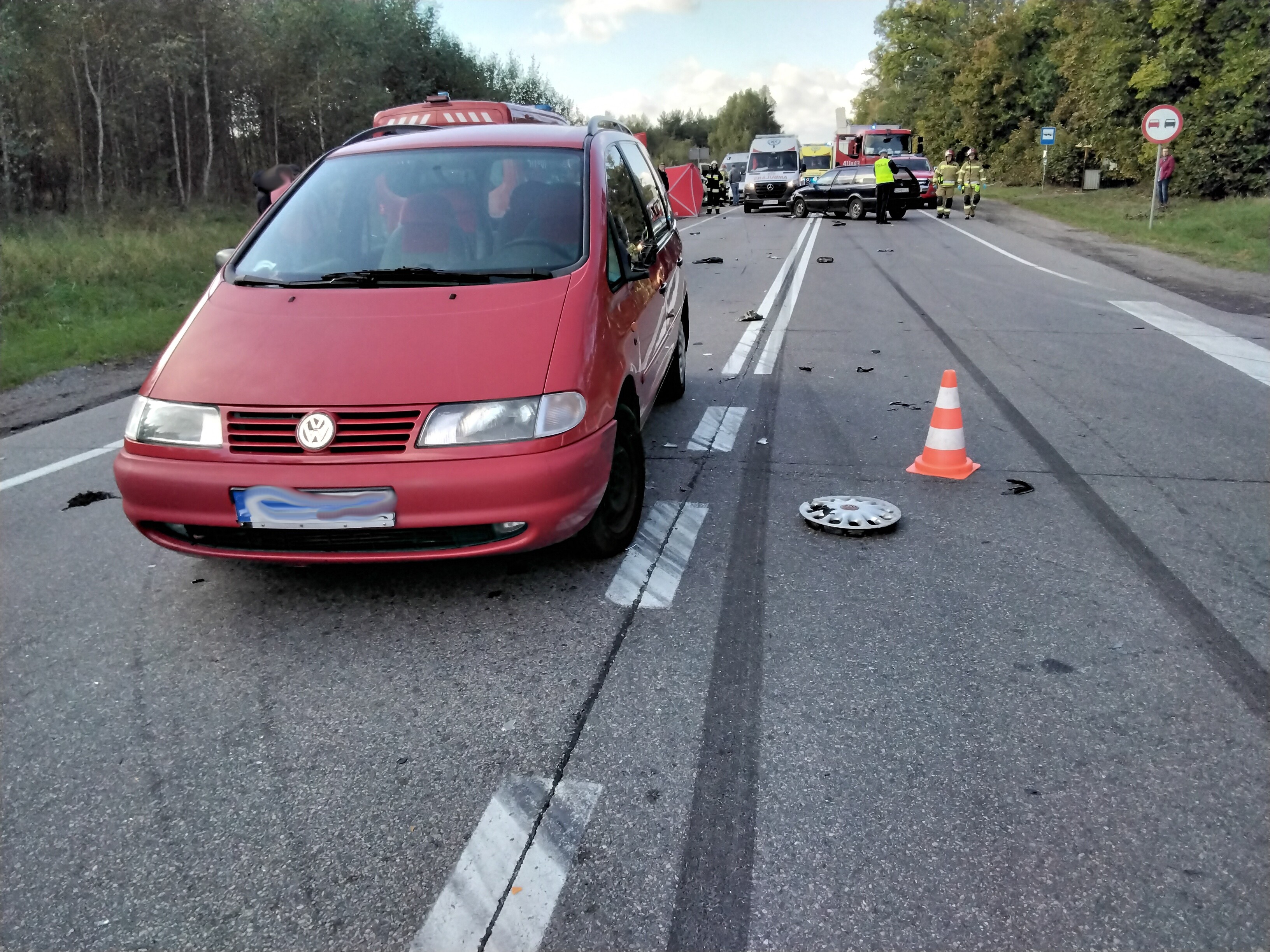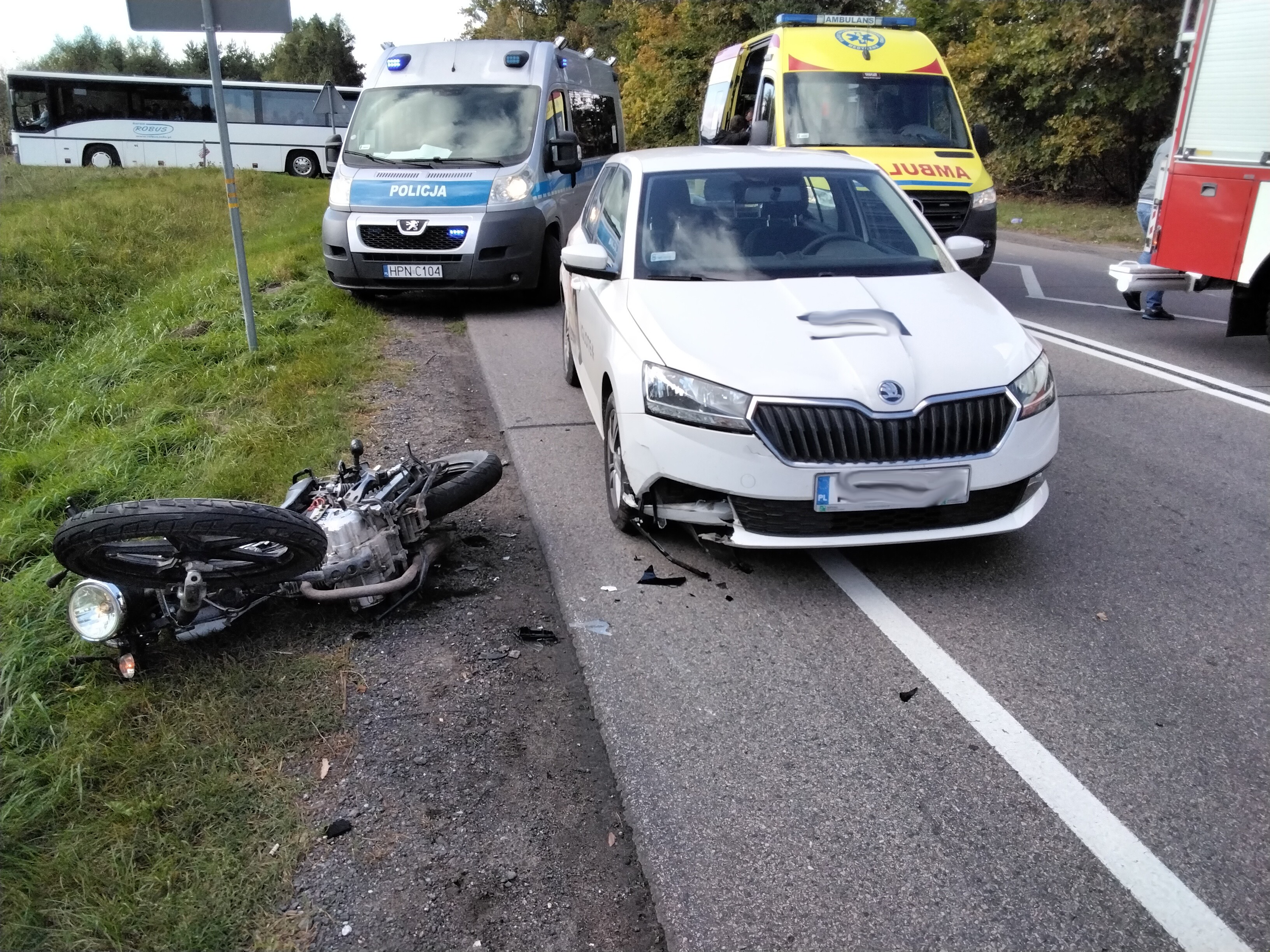 Po przybyciu na miejsce zdarzenia, i zabezpieczeniu miejsca zdarzenia udzielono kwalifikowanej pierwszej pomocy osobom poszkodowanym, kierujący jednośladem był nieprzytomny, bez funkcji życiowych więc przystąpiono do reanimacji do czasu przyjazdu Zespołu Ratownictwa Medycznego, który przejął działania medyczne. Ponadto odłączono zasilanie w pojazdach a następnie zneutralizowano wycieki z pojazdów za pomocą sorbentu. W zdarzeniu zostały uszkodzone dwa kolejne pojazdy osobowe. Jeden z zastępów udających się do wypadku, został przedysponowany do dużego pożaru hali produkcyjnej.