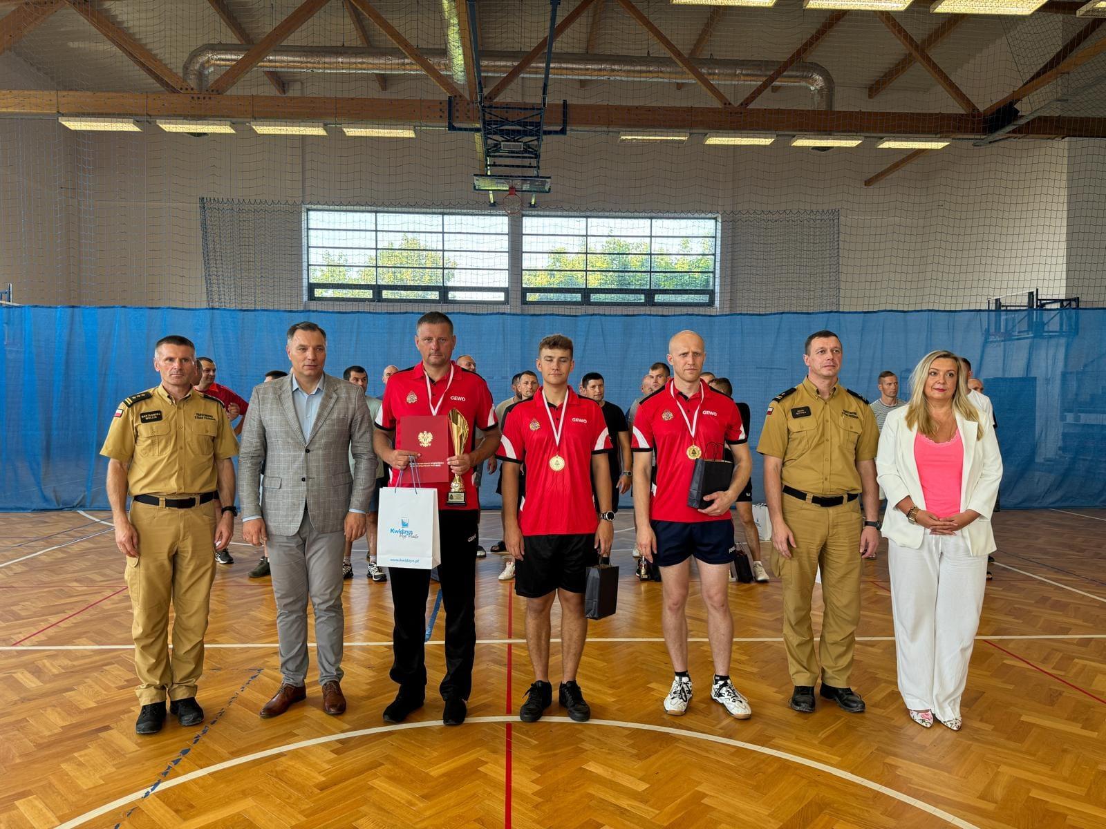 Puchary, medale, dyplomy oraz nagrody wręczył Zastępca Pomorskiego Komendanta Wojewódzkiego PSP st. bryg. Bartłomiej Mollin w asyście Komendanta Powiatowego PSP w Kwidzynie mł. bryg. Piotra Sztypki, Burmistrza Miasta Kwidzyna Pana Sebastiana Kasztelana oraz Członkini Zarządu Powiatu Kwidzyńskiego Pani Katarzyny Ochlik-Rafka.