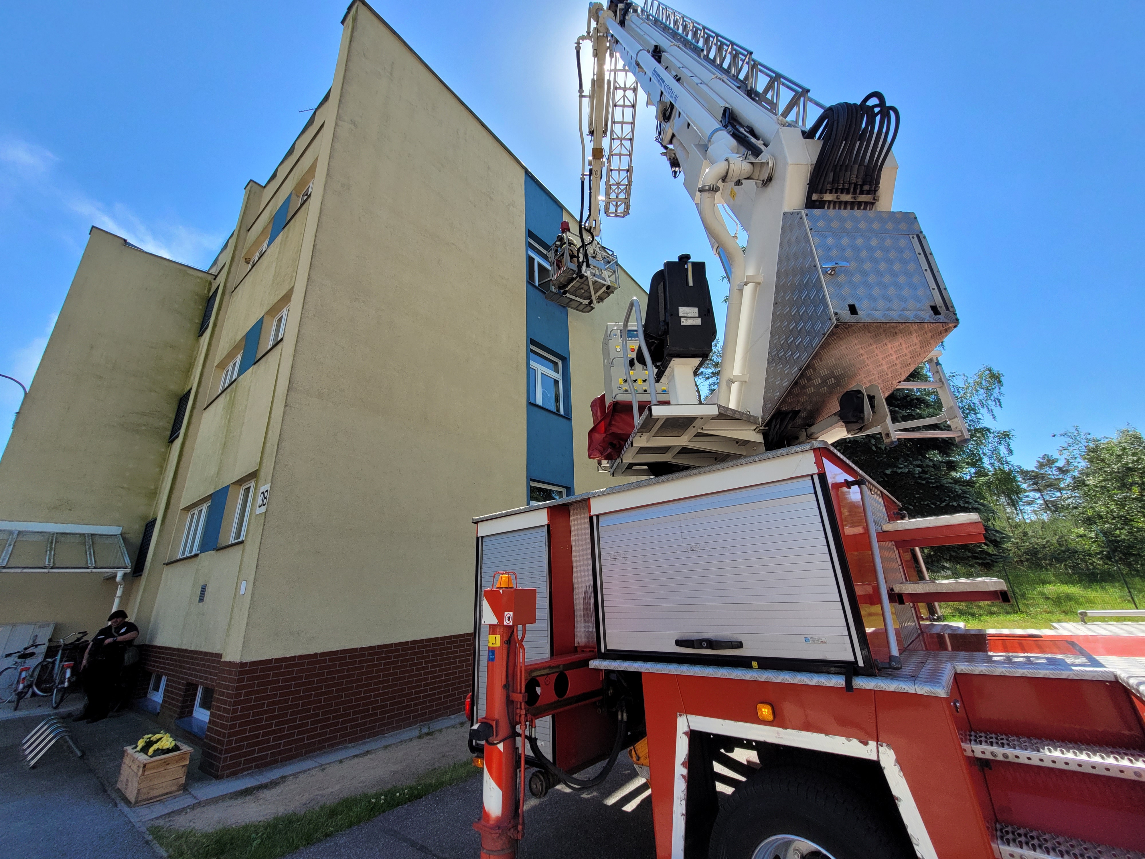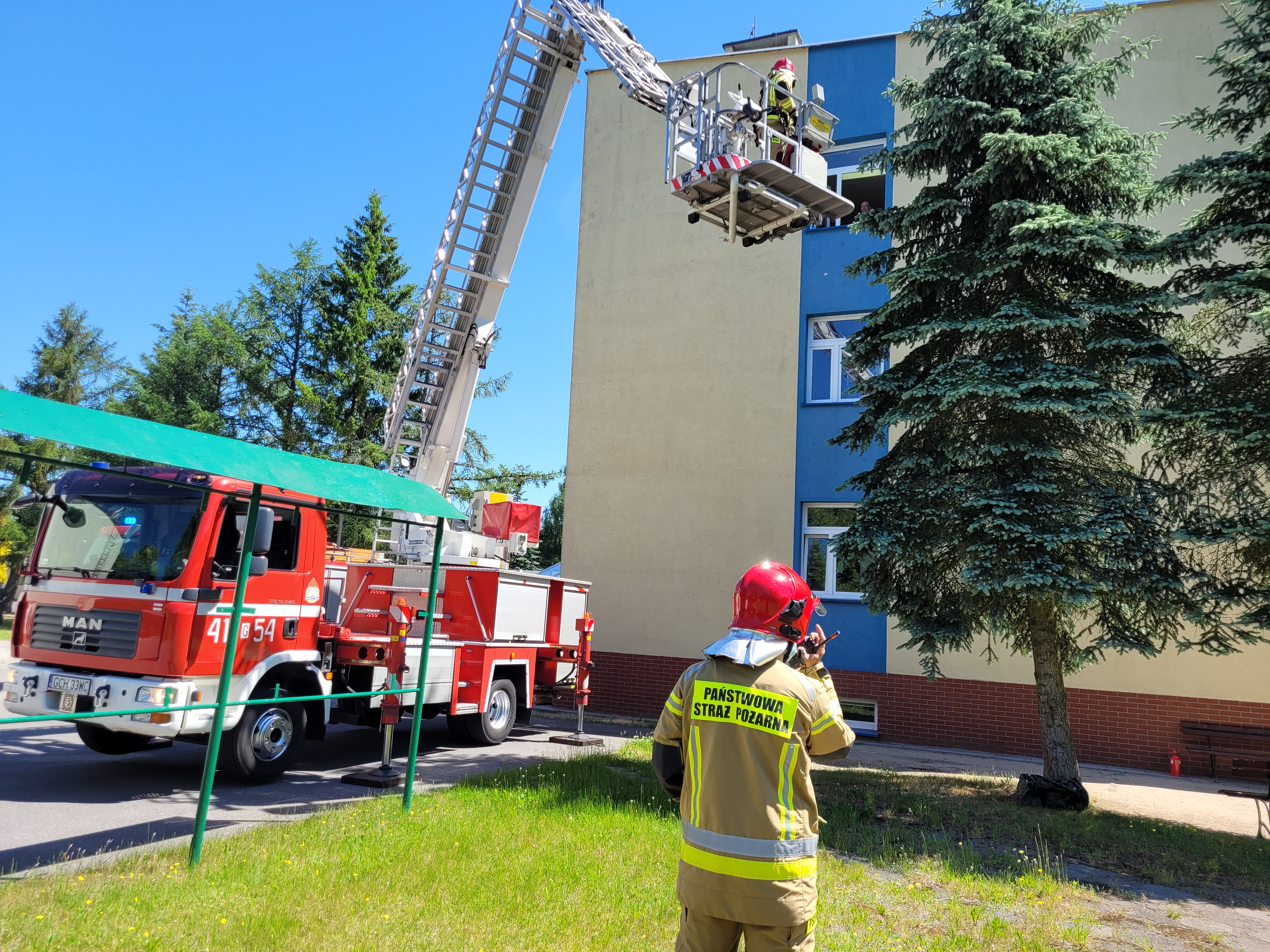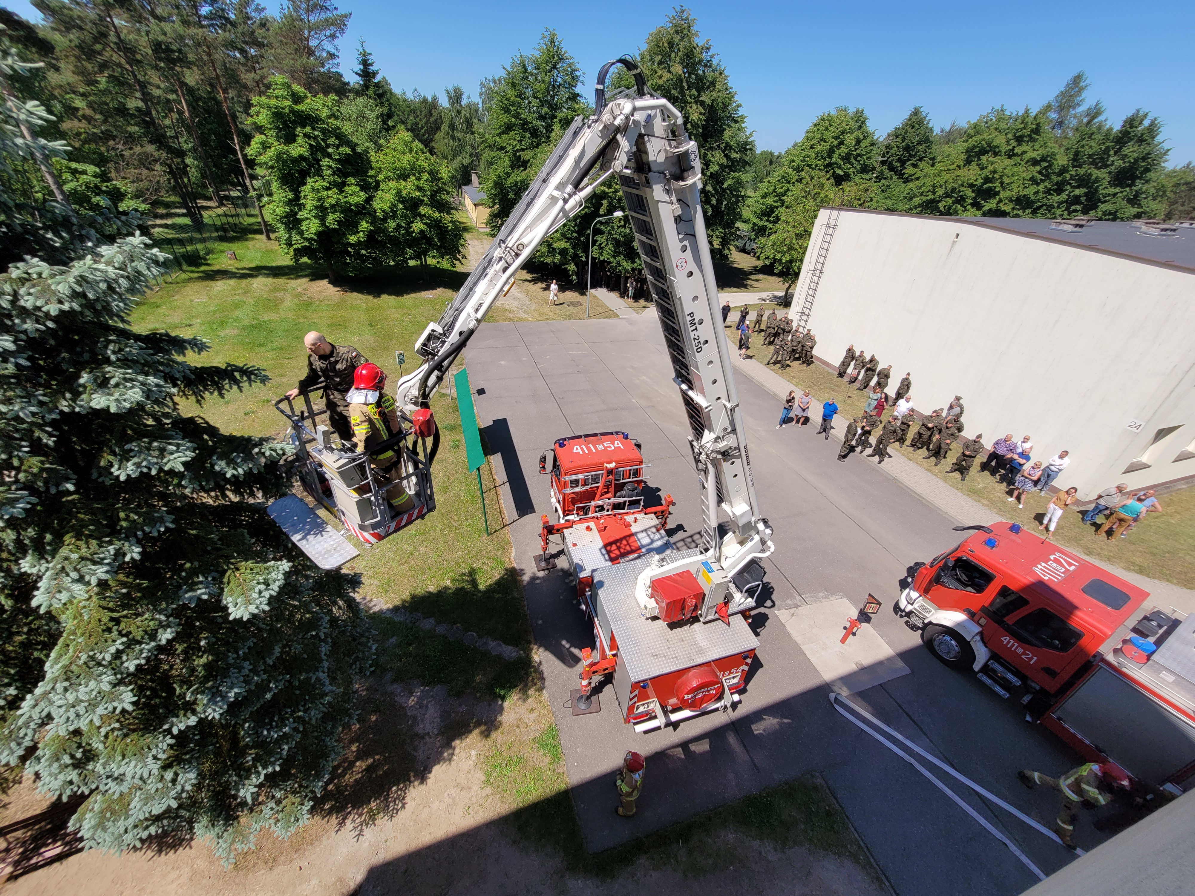 Scenariusz ćwiczeń zakładał wzniecenie pożaru w budynku biurowym, na skutek napadu nieprzyjaciela. W wyniku powstałego pożaru odcięta została droga ewakuacji dla osób znajdujących się na drugim piętrze i konieczne było użycie podnośnika celem ewakuacji na zewnątrz wszystkich pracowników.