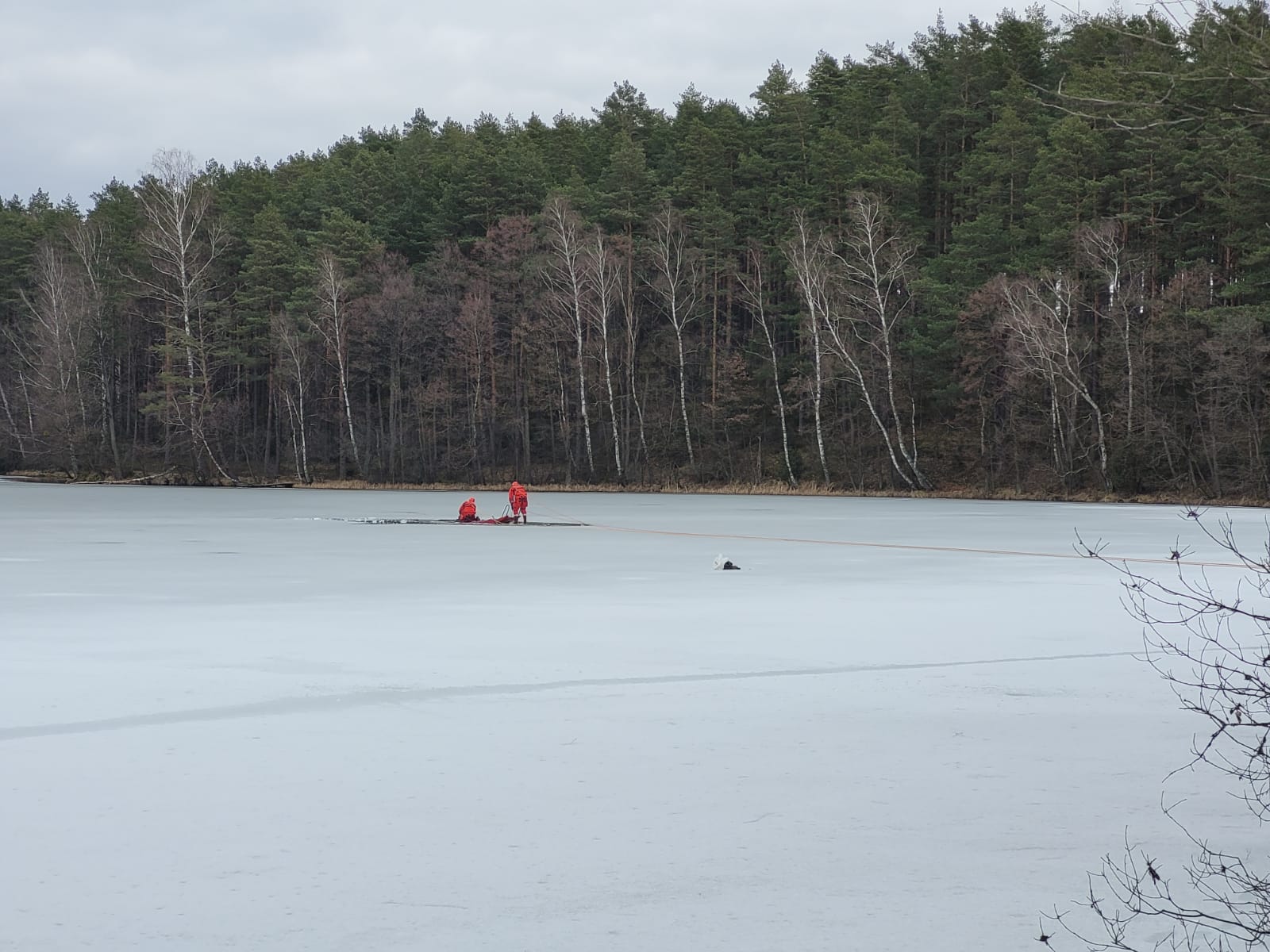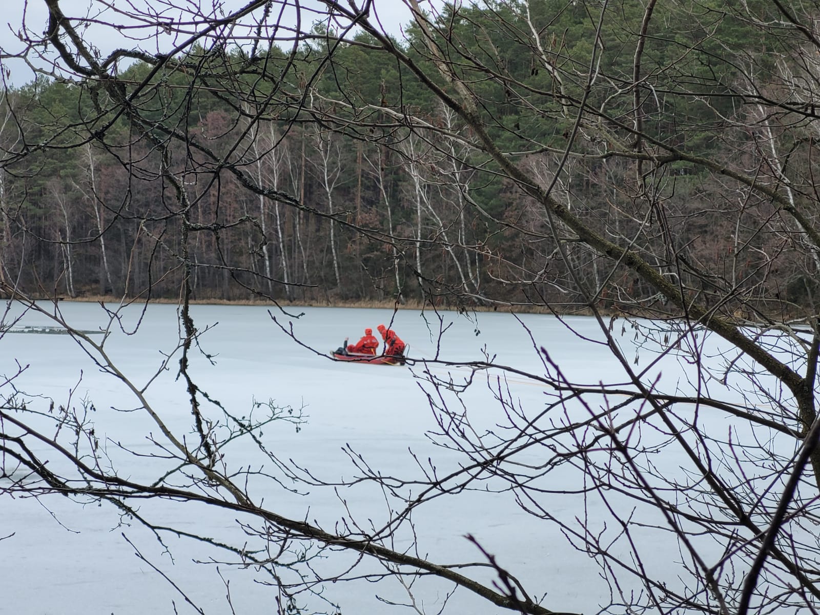 Po przybyciu pierwszych zastępów zabezpieczono miejsce zdarzenia. Strażacy w suchych skafandrach przy pomocy sań lodowych w zabezpieczeniu linkami podeszli do pozostawionych rzeczy, a następnie do widocznego przerębla oddalonego około 150 metrów od brzegu. Przerębel był częściowo zamarznięty. Wykonano otwór w przeręblu i sprawdzono czy pod wodą nie znajduję się topielec. Próba okazała się skuteczna i na powierzchnię wyciągnięto ciało mężczyzny, które natychmiast przetransportowane zostało na brzeg jeziora. Miejsce zdarzenia wraz z ciałem mężczyzny przekazano Policji.