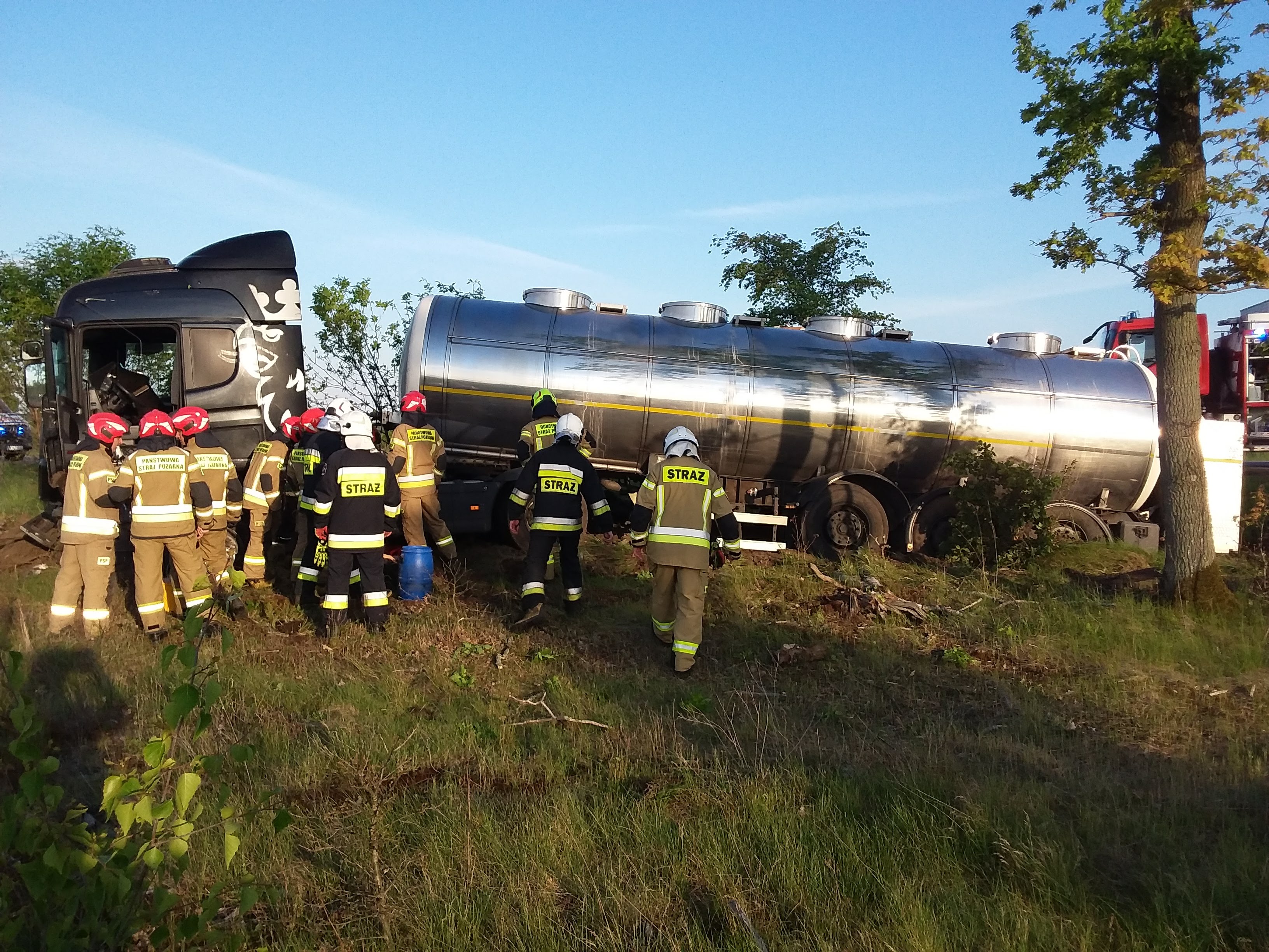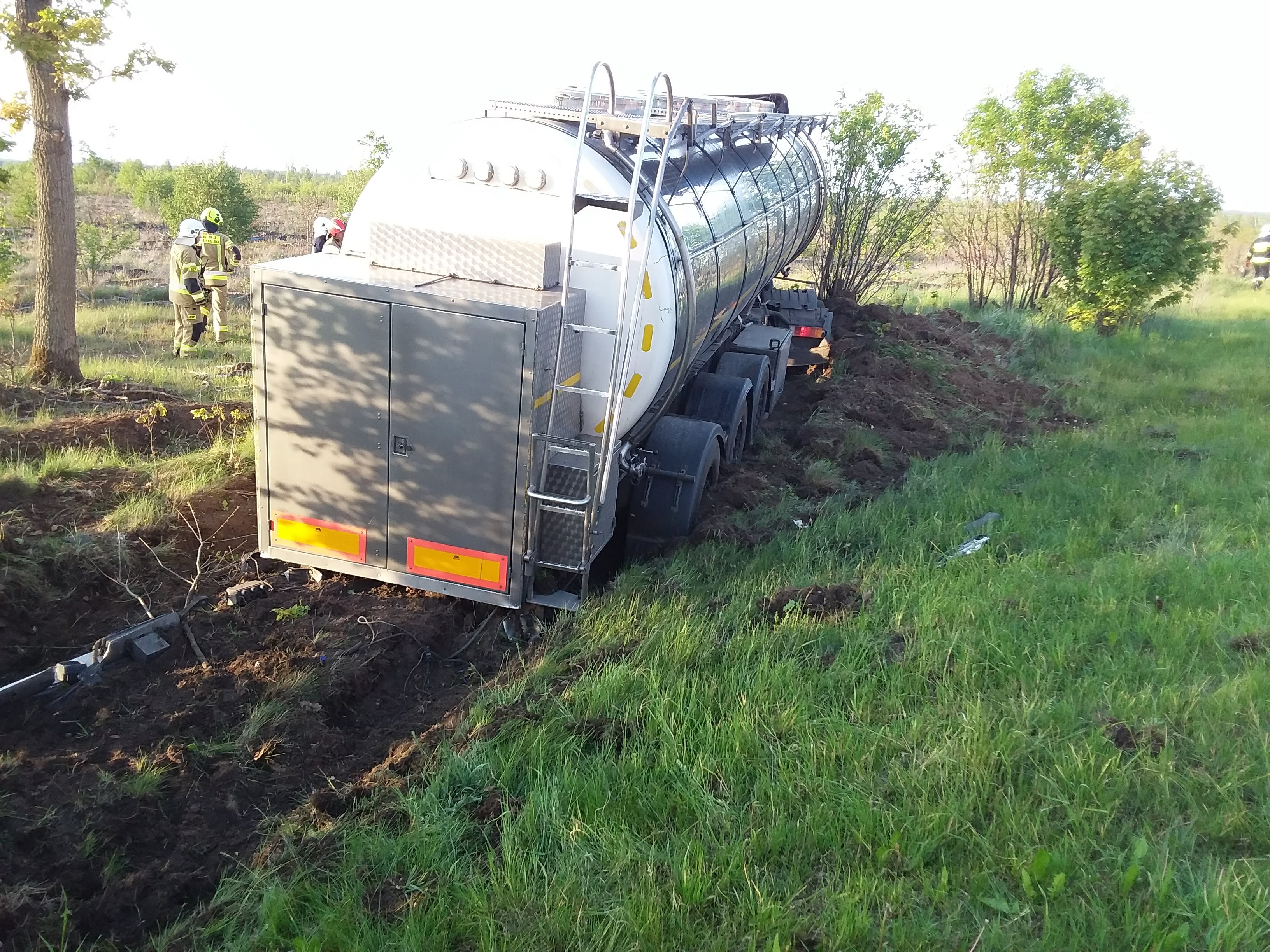 Po przybyciu na miejsce zdarzenia zastępów Straży Pożarnej stwierdzono że, ciągnik siodłowy z cysterną do przewozu artykułów spożywczych zjechał do przydrożnego rowu, w wyniku rozpoznania ustalono, że pojazdem podróżował tylko kierowca, który nie odniósł obrażeń. W wyniku zdarzenia doszło do rozszczelnienia się zbiornika z paliwem i wycieku oleju napędowego.