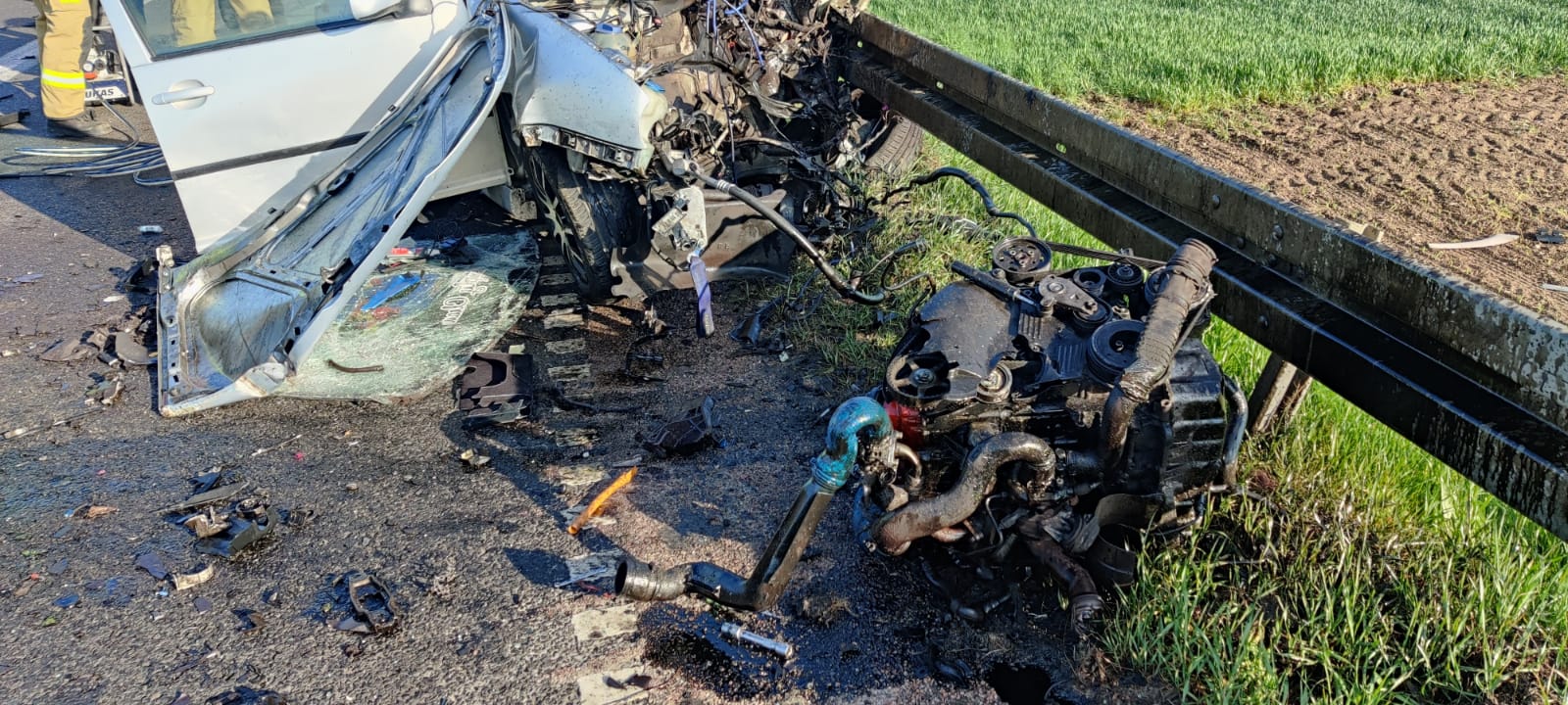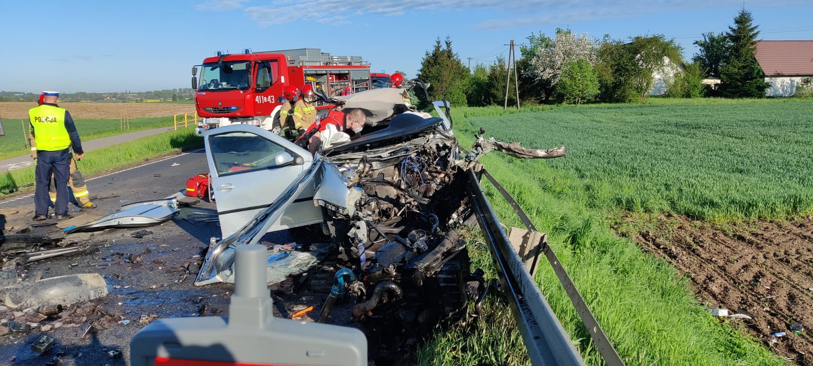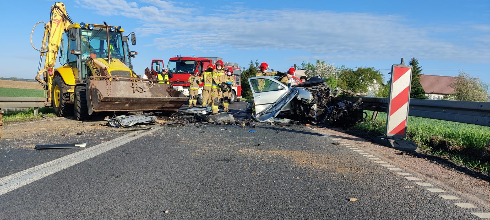 Po przybyciu na miejsce zdarzenia potwierdziła się informacja ze zgłoszenia. W samochodzie osobowym podróżowały dwie osoby, koparkoładowarką jedna. W celu ewakuacji osób poszkodowanych z samochodu osobowego strażacy wykorzystali hydrauliczne narzędzia. Po wykonaniu dostępu przystąpiono do udzielania kwalifikowanej pierwszej pomocy. Niestety przybyły na miejsce Zespół Ratownictwa Medycznego, stwierdził zgon mężczyzny, pasażera samochodu osobowego. Działania zastępów polegały również na zabezpieczeniu miejsca zdarzenia, odłączeniu zasilania w pojazdach a po czynnościach dochodzeniowych Policji uprzątnięto jezdnię z olejów i płynów eksploatacyjnych.