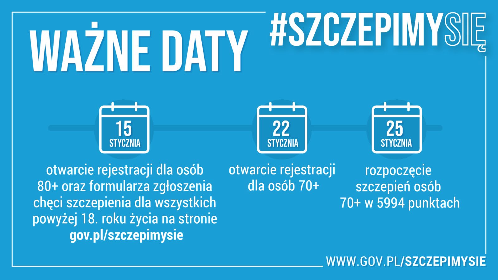 - 15 stycznia 2021 roku rozpoczyna się rejestracja na szczepienia przeciw COVID-19 dla seniorów, którzy skończyli 80 lat (urodzeni w 1941 roku i wcześniej),