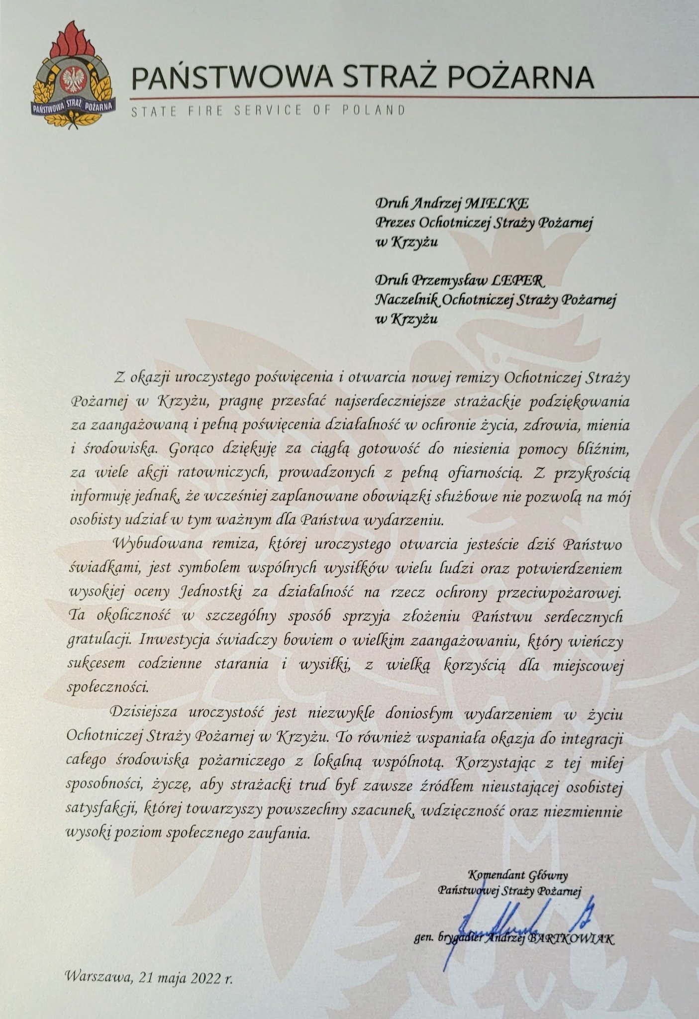 Dnia 21 maja 2022 roku odbyła się uroczysta zbiórka z okazji otwarcia budynku remizy strażackiej jednostki Ochotniczej Straży Pożarnej w Krzyżu, w gminie Czersk.