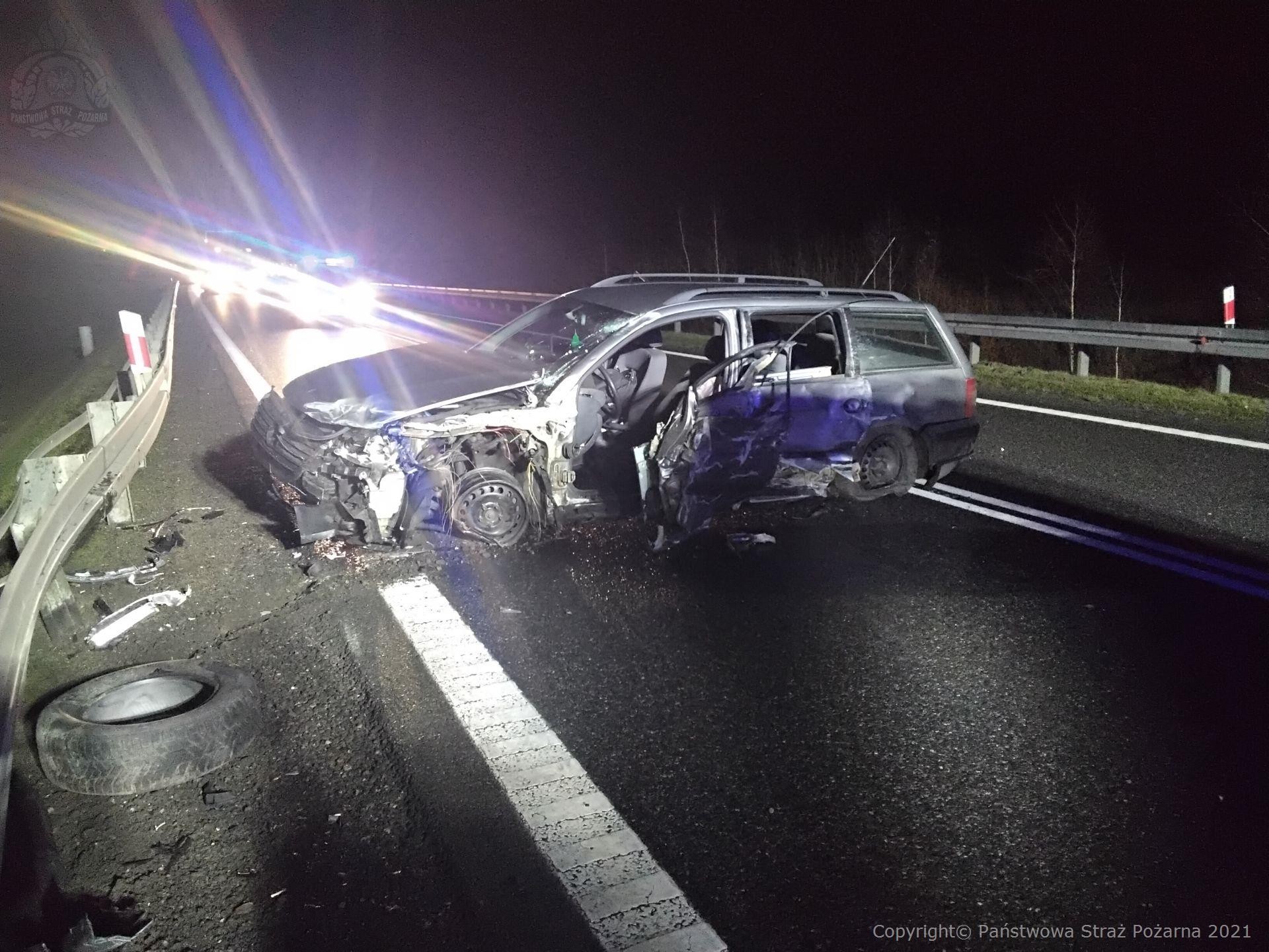 Po przybyciu na miejsce zdarzenia zastępów z Jednostki Ratowniczo Gaśniczej w Chojnicach stwierdzono że, doszło do zderzenia samochodu osobowego z samochodem dostawczy. Droga na tym odcinku była zablokowana a policja wytyczyła objazdy. Działania zastępów polegały na zabezpieczeniu miejsca akcji, oświetleniu terenu i sprawdzeniu stanu osób biorących udział w zdarzeniu. Przybyły na miejsce Zespół Ratownictwa Medycznego po przebadaniu uczestników zdarzenia nie podął decyzji o transporcie do szpitala. Miejsce zdarzenia uprzątnięto a jezdnię udrożniono. Na miejsce przybyli przedstawiciele GDDKiA, którzy razem z Policją zabezpieczali miejsce postoju samochodu dostawczego.