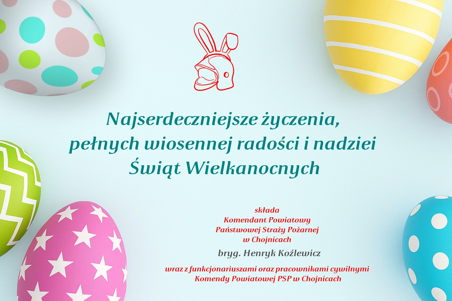 Z okazji Świąt Wielkanocnych składam Państwu najserdeczniejsze życzenia zdrowia, spokoju oraz wszelkiej pomyślności. Niech ten wyjątkowy czas napełni serca nadzieją, a codzienną służbę umocni w poczuciu misji i solidarności. Życzę, aby chwile spędzone w gronie najbliższych przyniosły wytchnienie i radość. Zmartwychwstanie Pańskie niech będzie źródłem siły, otuchy i wiary w lepsze jutro. Wesołych, pogodnych i bezpiecznych Świąt Wielkanocnych.