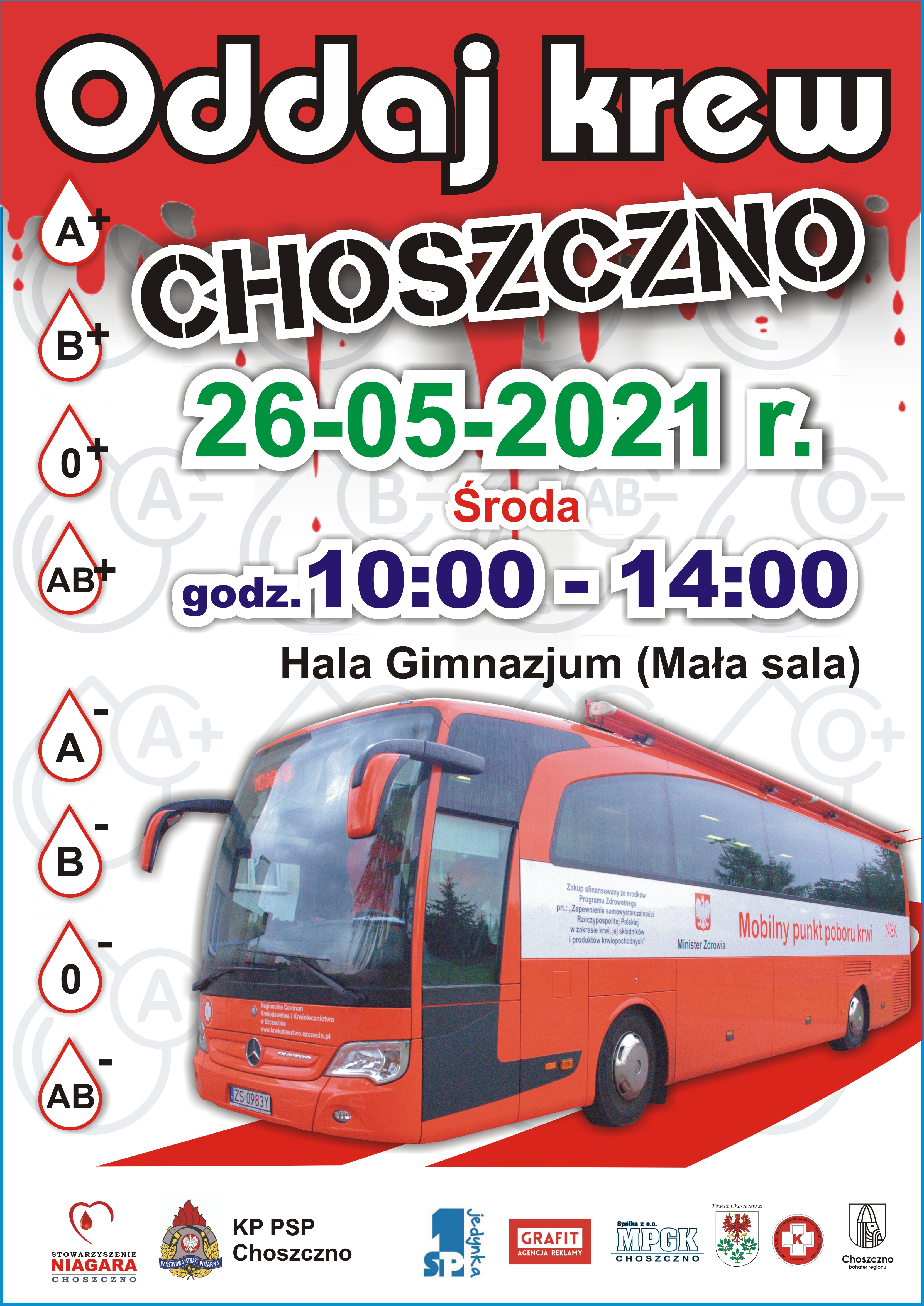 W najbliższą środę (26 maja 2021 roku) odbędzie się kolejna akcja honorowego krwiodawstwa w Choszcznie - serdecznie zachęcamy do udziału w niej.