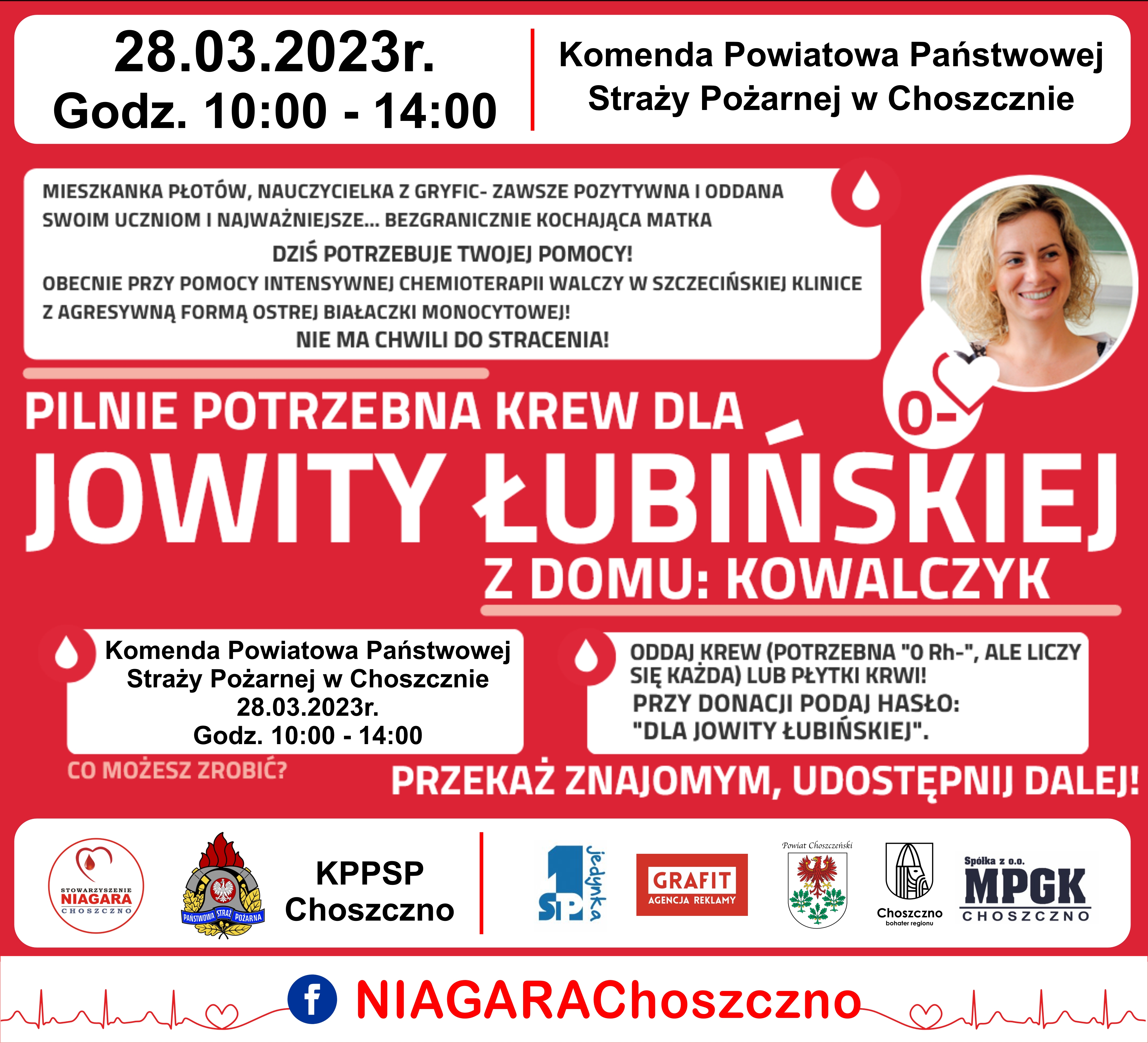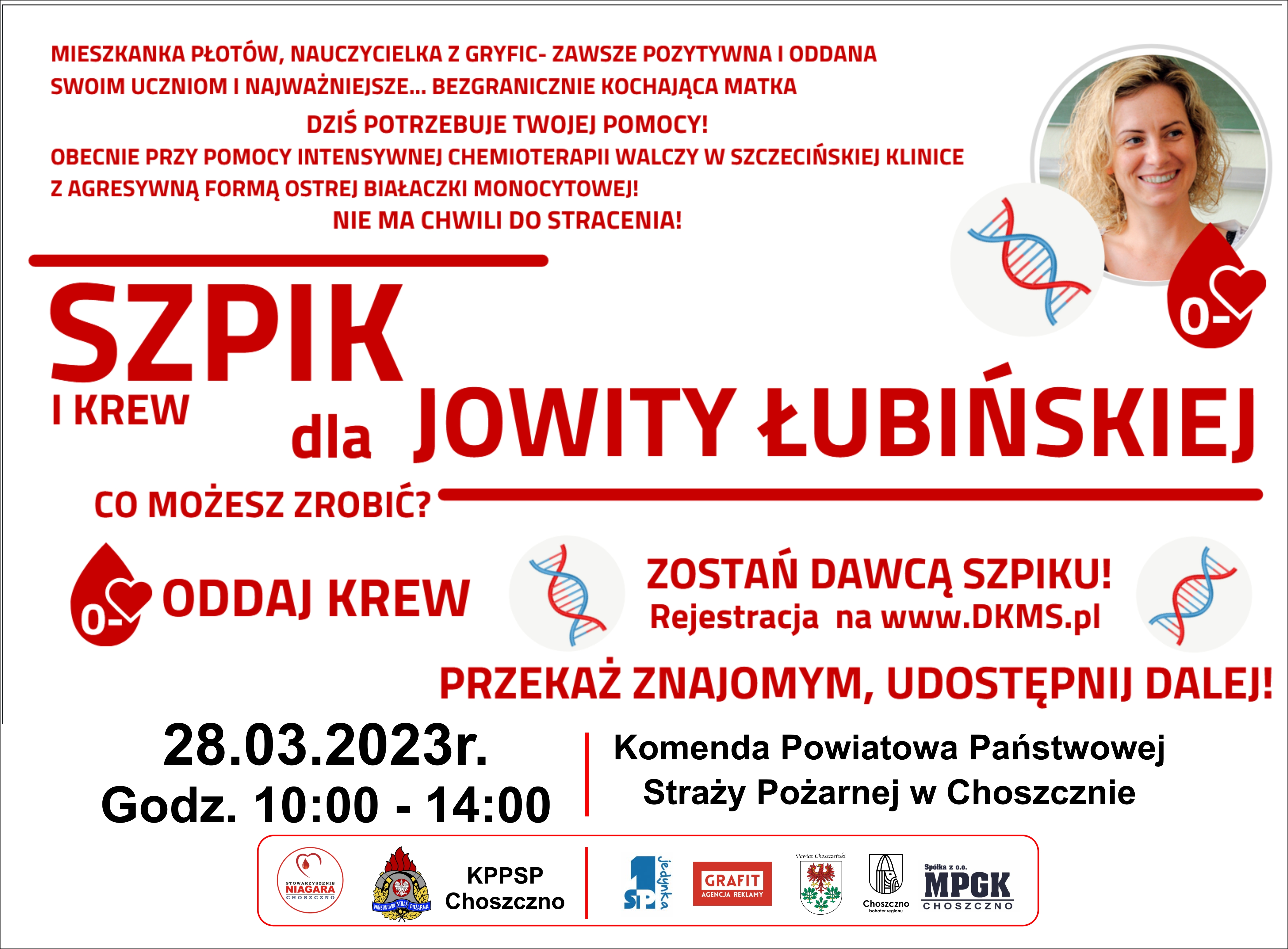 28 marca 2023r. (wtorek), zapraszamy na akcję krwiodawstwa na której będziemy zbierać krew dla pani Jowity, która zachorowała na agresywną formę białaczki monocytowej i przebywa aktualnie w szczecińskiej klinice.