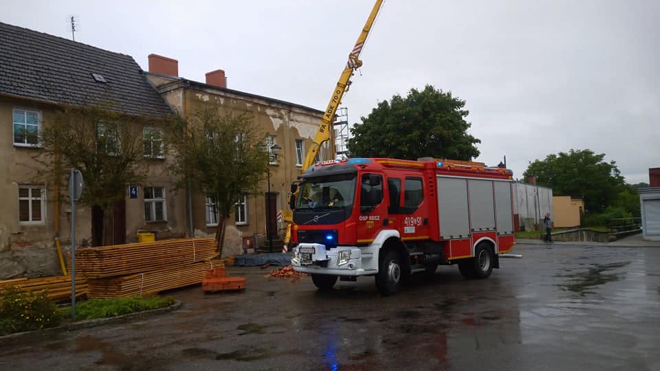 Po przybyciu na miejsce zdarzenia zastępu OSP Recz potwierdzono, że dwa mieszkania zalewane są przez opad deszczu poprzez niewłaściwie zabezpieczony dach. Strażacy odłączyli dopływ energii elektrycznej do budynku. W mieszkaniach uszkodzone przez wodę zostały sufity kartonowo-gipsowe oraz podłogi. Przybyłe na miejsce pogotowie energetyczne sprawdziło instalację elektryczną w budynku. Dach został zabezpieczony przy pomocy plandek. W działaniach udział zastęp OSP Recz.