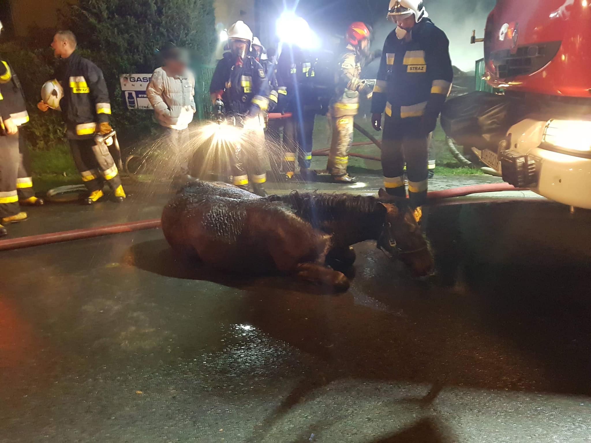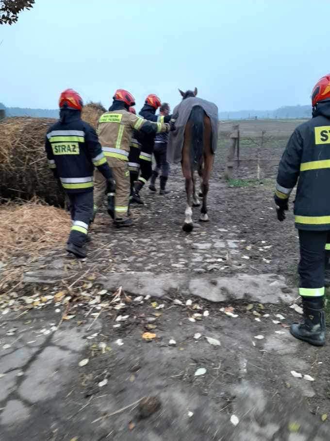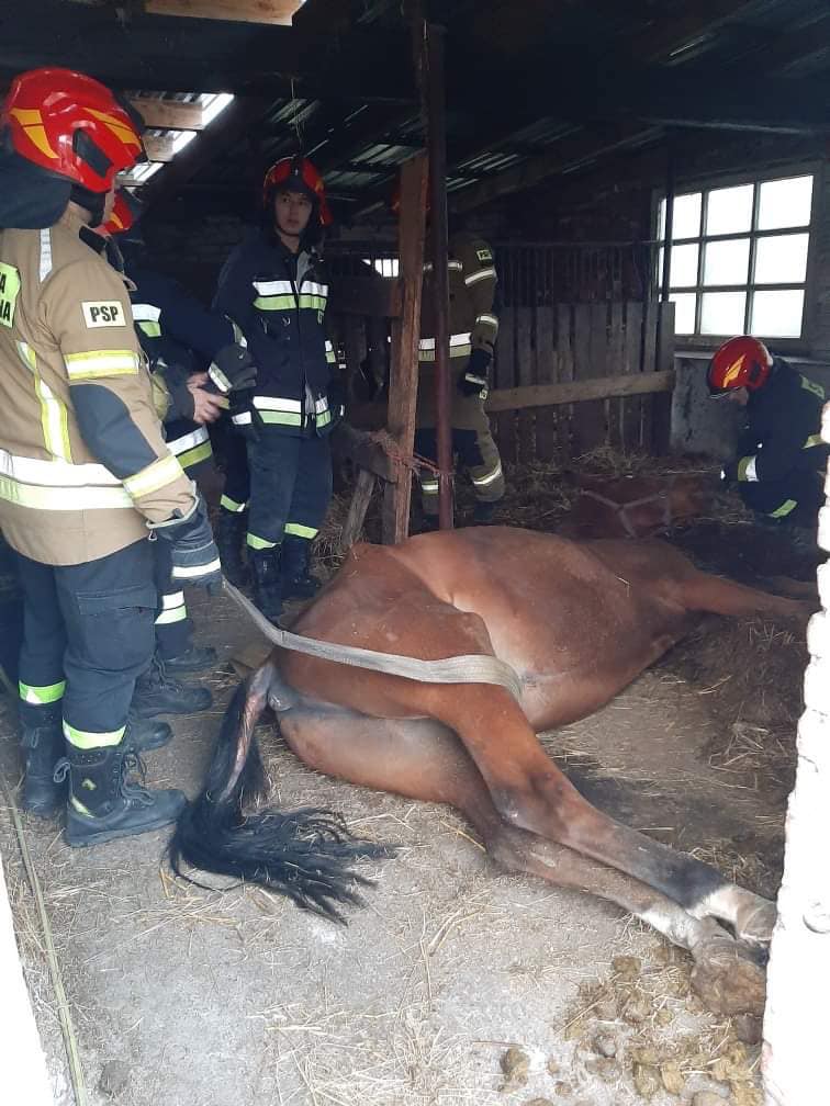Kilka dni później wystąpiło następne zdarzenie z udziałem konia, który wymagał pomocy strażaków. Koń przebywający w stajni upadł i nie mógł samodzielnie wstać. Podczas kilku prób samodzielnego podniesienia się, uległ zranieniu. Przybyli na miejsce strażacy, przy użyciu pasów transportowych podnieśli konia na nogi i przekazali właścicielowi.