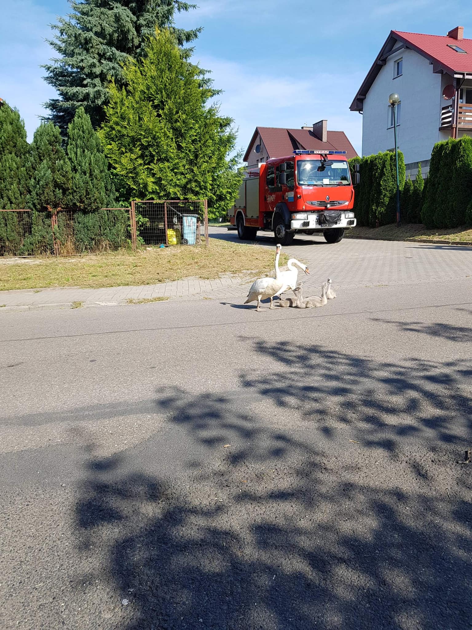 ŁABĘDZIE NA WYCIECZCE - Zdarzają się również sytuacje, w których ptaki wodne wymagają pomocy strażaków. W porze zimowej, łabędzie przymarzają do tafli lodu, natomiast latem wybierają się na wycieczki – jednocześnie tworząc zagrożenie dla siebie i innych uczestników ruchu. W obu sytuacjach strażacy ruszają z pomocą odprowadzają ptaki do akwenu, który opuściły.