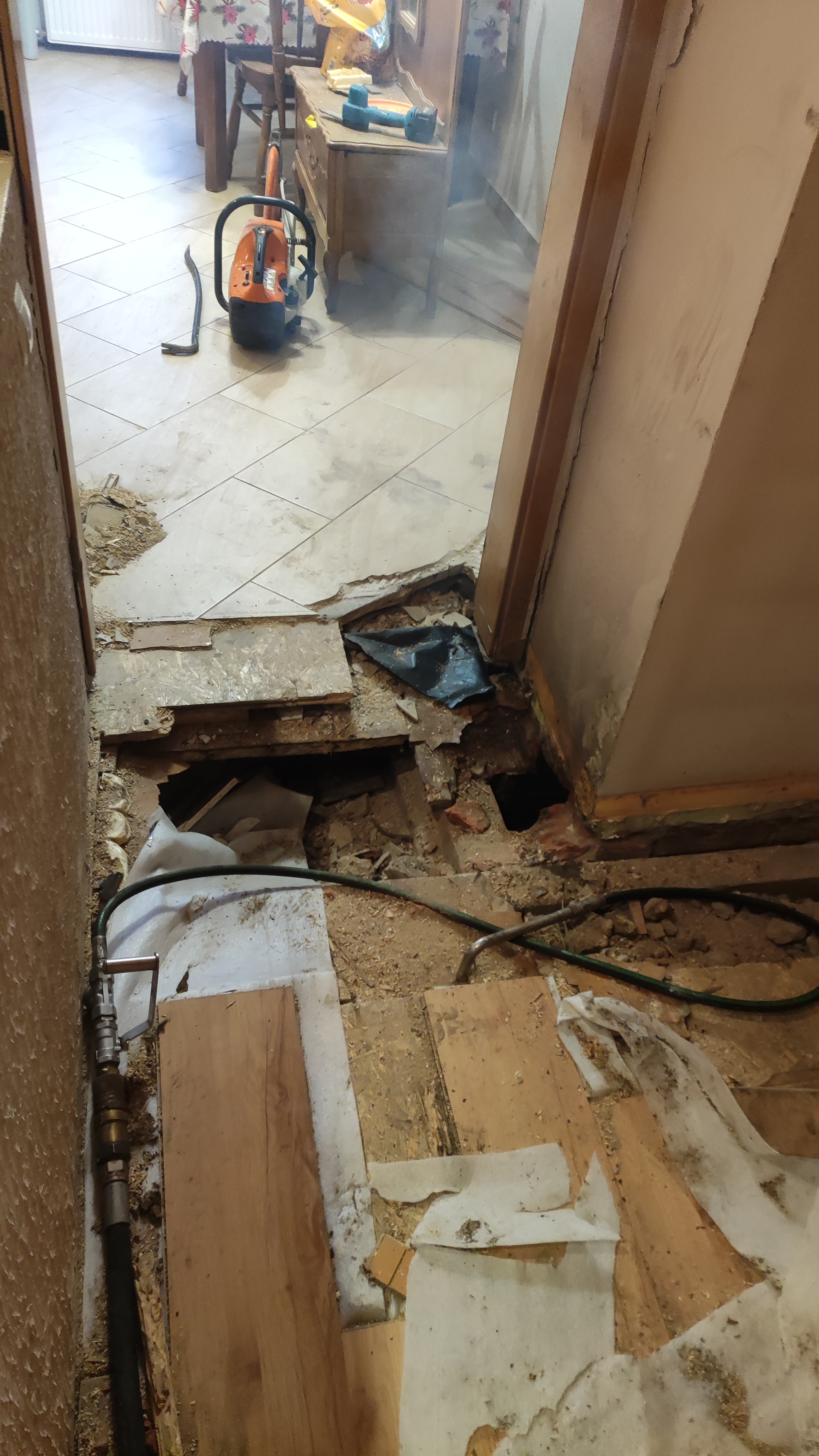 Działania okazały się być utrudnione ze względu na wydostanie się ognia poza przewód kominowy. Konieczne okazało się zdemontowanie części podłogi oraz sufitu w mieszkaniach sąsiadujących z kominem. Po wykonaniu dostępu ratownicy ujrzeli płomienie obejmujące drewniane belki konstrukcyjne, rozprzestrzenianie się pożaru zostało powstrzymane, poprzez podanie prądu wody z mgłowej lancy kominowej.