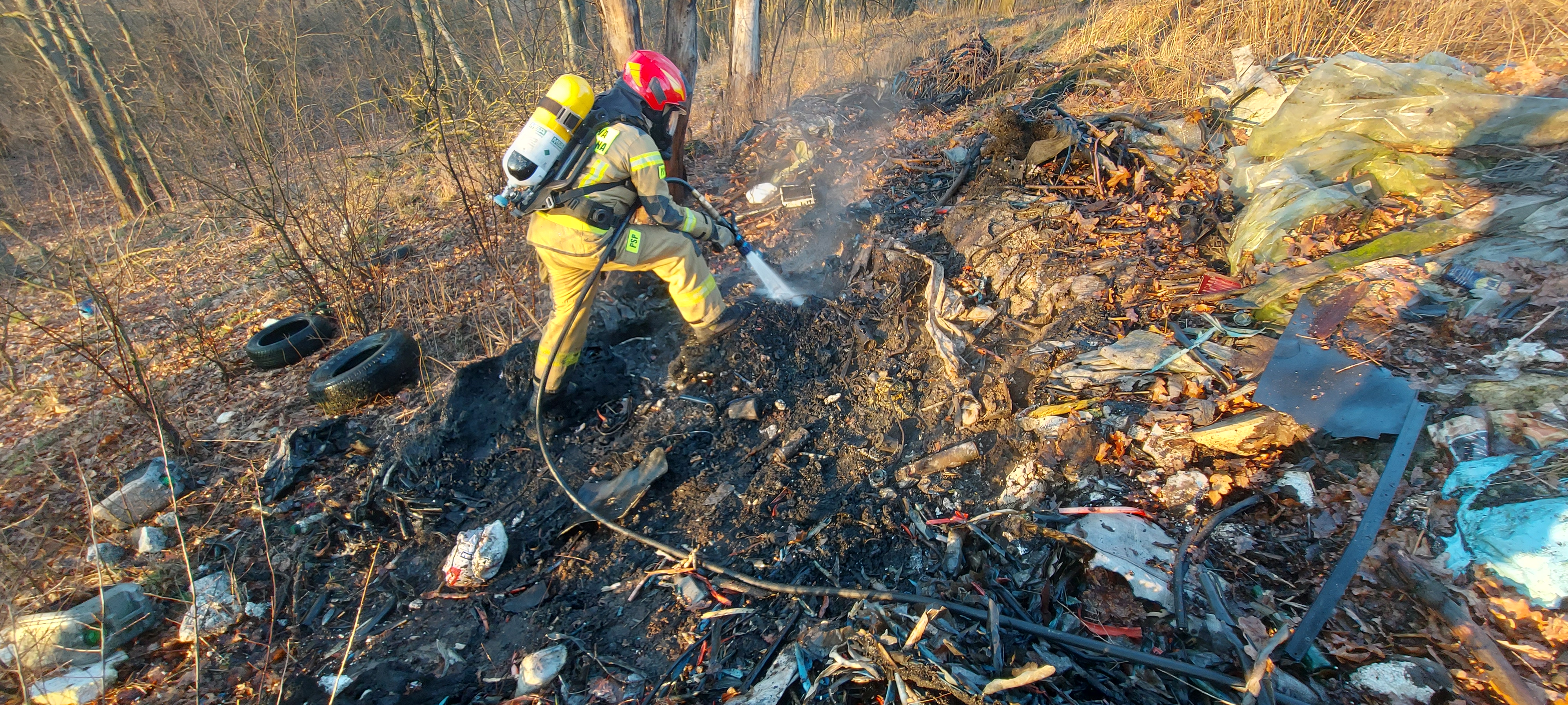 pożar dzikiego wysypiska śmieci, głównie plastików. Pożar ugaszono podając jeden prąd wody wnatarciu. Do działań zadysponowano jeden zastęp z JRG Choszczno.