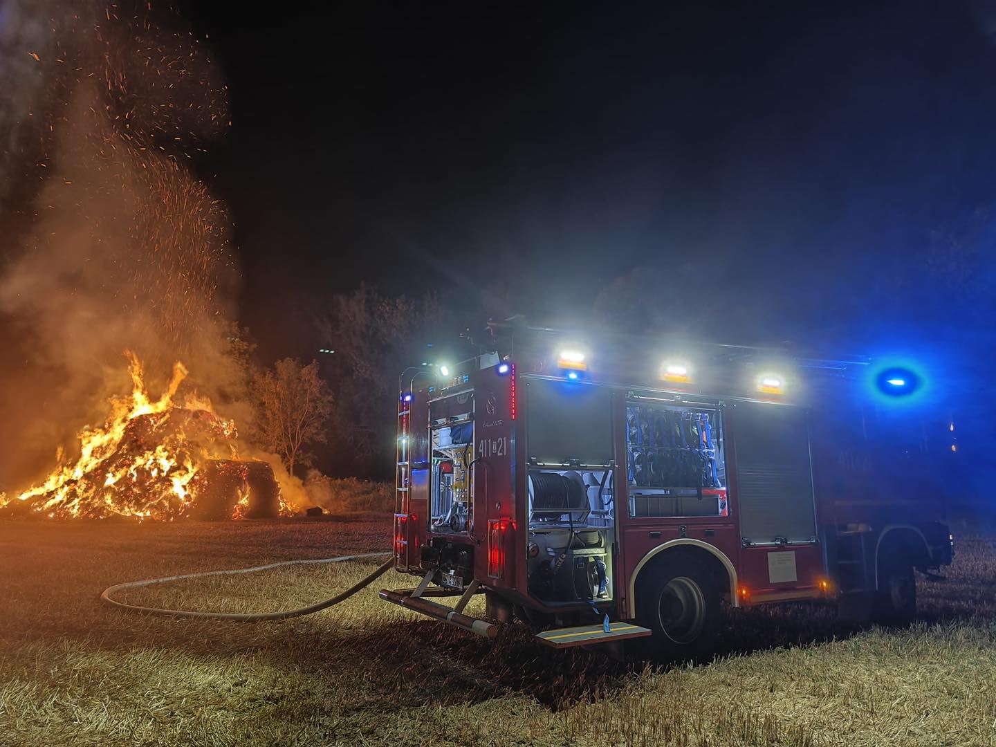 Po dojeździe na miejsce zdarzenia strażacy zastali stóg z balotami słomy, który cały objęty był ogniem.