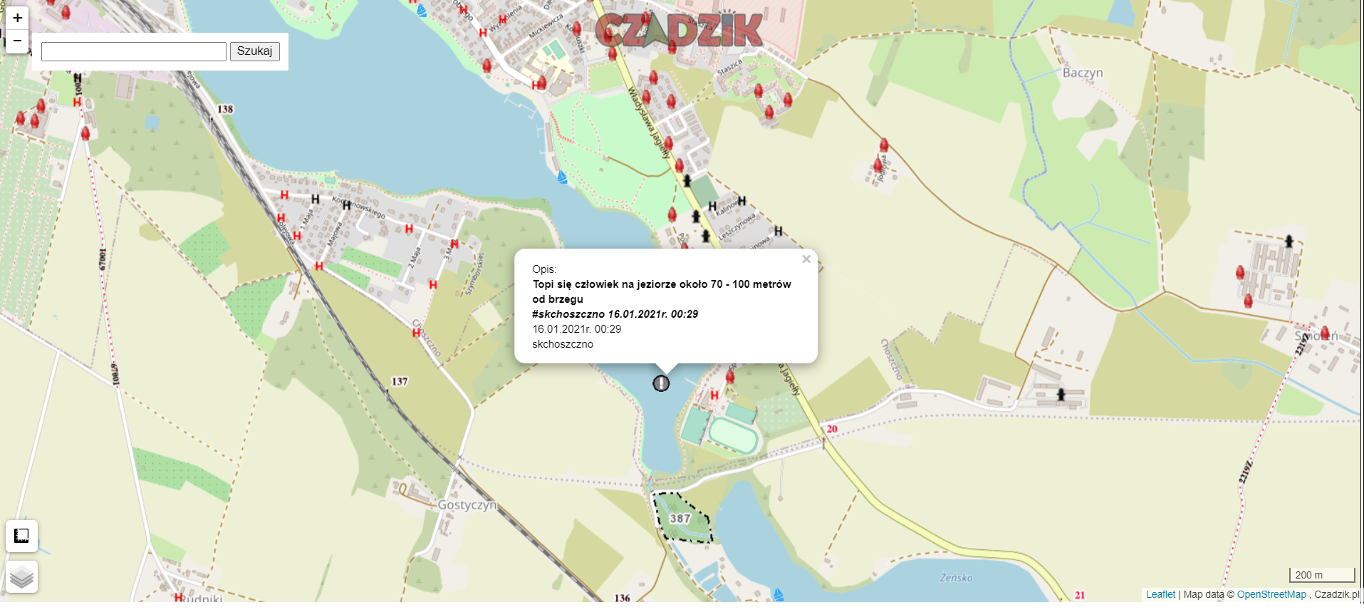 16 stycznia 2021 roku, około godziny 00:29 do Stanowiska Kierowania Komendanta Powiatowego PSP w Choszcznie wpłynęło zgłoszenie o 19-letnim mężczyźnie, który topi się jeziorze Klukom, a drugi – 21-letni mężczyzna podjął próbę ratowania wskakując do wody. Dramat rozgrywał się tuż przy pomoście znajdującym się w pobliżu ul. Sportowej w Choszcznie. Dyżurny operacyjny natychmiast zadysponował na miejsce zdarzenia trzy zastępy z jednostki ratowniczo-gaśniczej w Choszcznie, które po dojeździe przystąpiły do działań. Strażacy przy użyciu sań lodowych oraz pontonu w ostatniej chwili podjęli tonącego mężczyznę, który był wyziębiony, a także nie było z nim logicznego kontaktu. Dzięki sprawnej akcji strażaków udało się uniknąć tragedii. Obaj poszkodowani mężczyźni zostali przetransportowani do szpitala przez Zespoły Ratownictwa Medycznego.