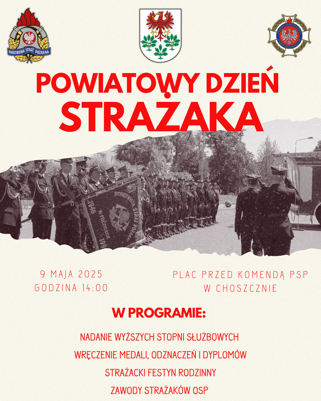 Szanowni Państwo, serdecznie zapraszamy na Powiatowe Obchody Dnia Strażaka 2025, które odbędą się w piątek 9 maja o godzinie 14:00 na placu przed Komendą PSP w Choszcznie.